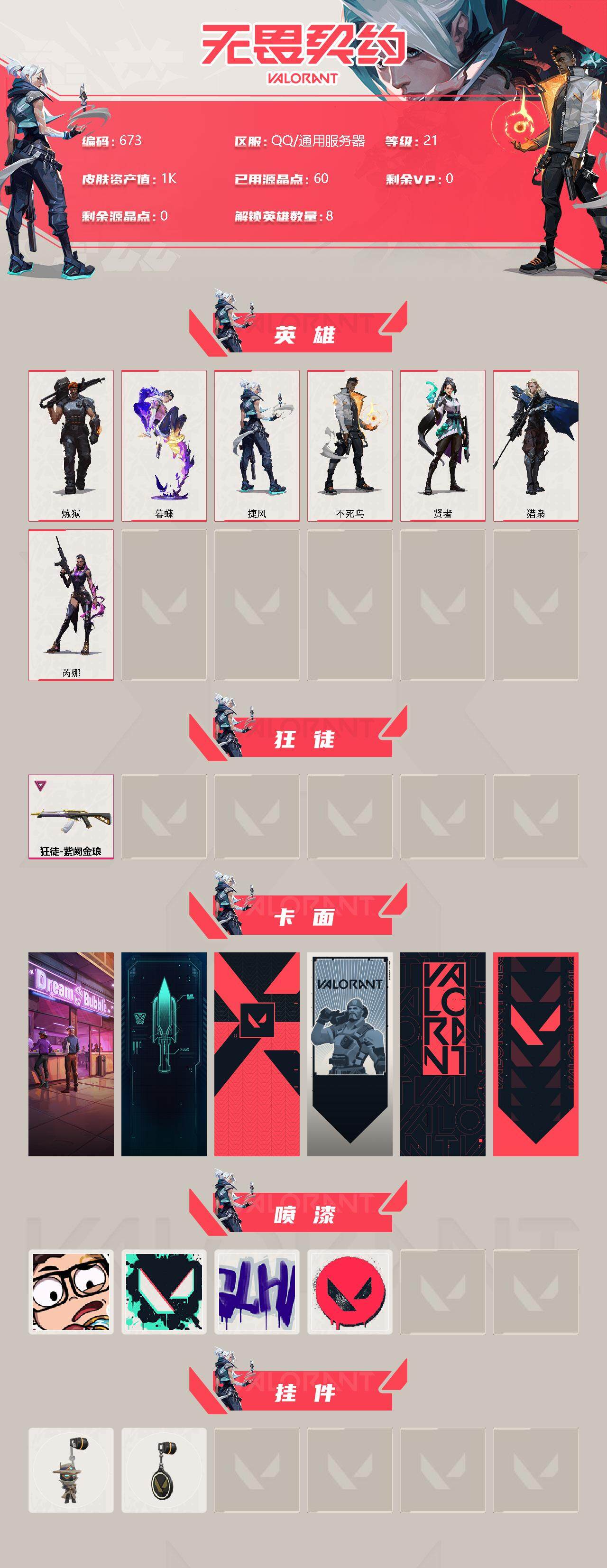 [12959509]【英雄】:炼狱,暮蝶,捷风,不死鸟,贤者,猎枭,芮娜 【狂徒】:狂徒-紫阙金琅 【卡面】:梦幻奶茶 卡面,零点嗅探设计图 卡面,代号红色 卡面,新兵报到 卡面,V契约 卡面,无畏契约 卡面 【喷漆】:新潮流 喷漆,胜利属于无畏契约 喷漆,GLHF 喷漆,无畏契约 喷漆 【挂饰】:无畏契约GO!第一卷 零 挂饰,无畏契约 纪念币 挂饰