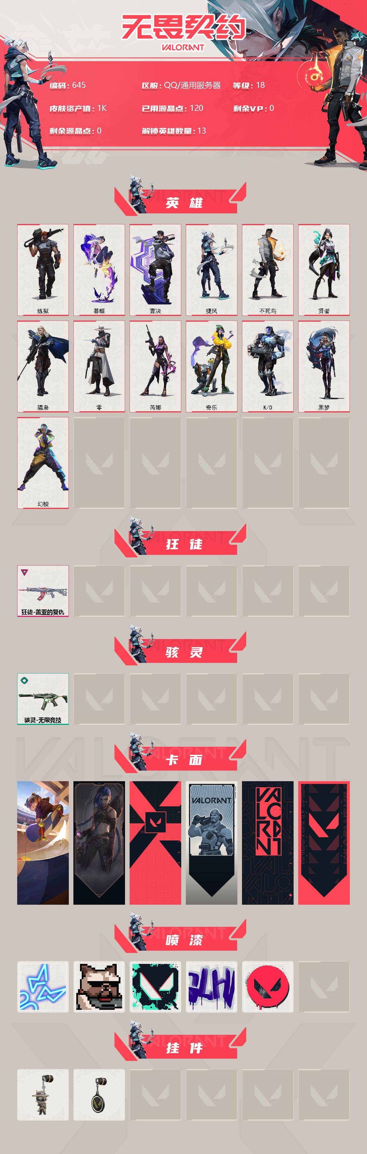 [12959225]【英雄】:幻棱,炼狱,暮蝶,壹决,捷风,不死鸟,贤者,猎枭,零,芮娜,奇乐,K/O,黑梦 【狂徒】:狂徒-盖亚的复仇 【骇灵】:骇灵-无限竞技 【卡面】:Clutch 卡面,《双城之战》金克丝 卡面,代号红色 卡面,新兵报到 卡面,V契约 卡面,无畏契约 卡面 【喷漆】:霓光四射 喷漆,关门放狗 喷漆,胜利属于无畏契约 喷漆,GLHF 喷漆,无畏契约 喷漆 【挂饰】:无畏契约GO!第一卷 零 挂饰,无畏契约 纪念币 挂饰