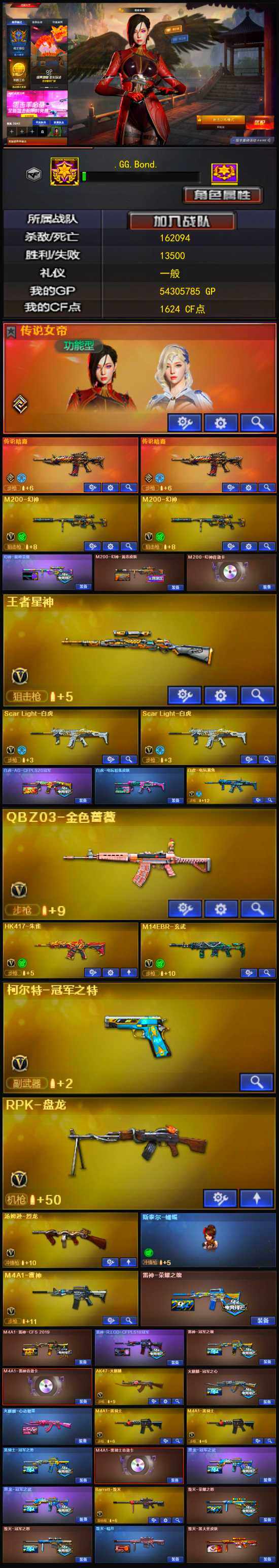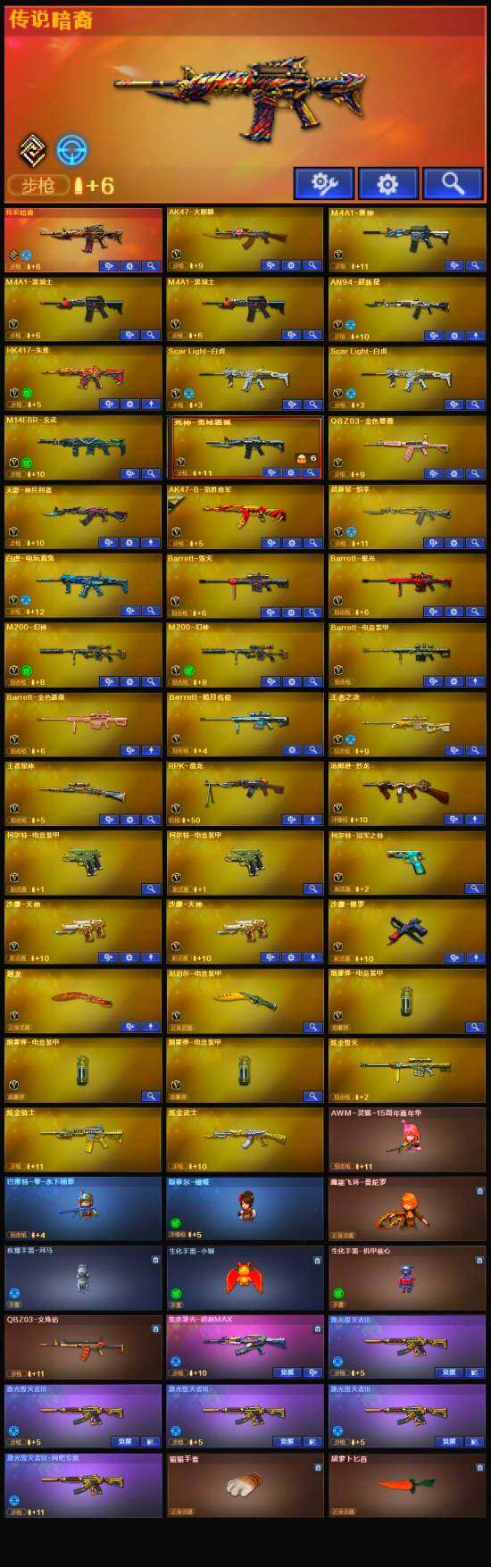 【热门武器】:传说暗裔*2,QBZ03-金色蔷薇,M14EBR-玄武,Scar Light-白虎*2,HK417-朱雀,M200-幻神*2,白虎-电玩蓝兔,柯尔特-冠军之特,M4A1-黑骑士*2,汤姆逊-烈龙,RPK-盘龙,斯泰尔-蝴蝶,沙鹰-修罗