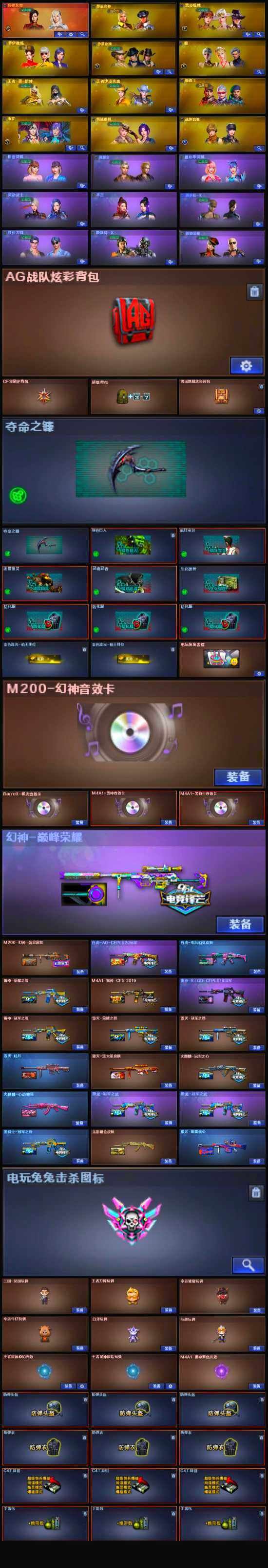 【稀有皮肤】:M200-幻神-黄忠皮肤,幻神-巅峰荣耀,白虎-AG-CFPLS20冠军,白虎-电玩粉兔皮肤,雷神-荣耀之魄,M4A1-雷神-CFS 2019,雷神-冠军之魄,雷神-R.LGD-CFPLS18冠军,火麒麟-冠军之心,火麒麟-心动糖果,黑骑士-冠军之势,黑龙-冠军之武*2,毁灭-暗月,毁灭-荣耀之怒,毁灭-冠军之怒,毁灭-黑大圣皮肤,无影耀金皮肤