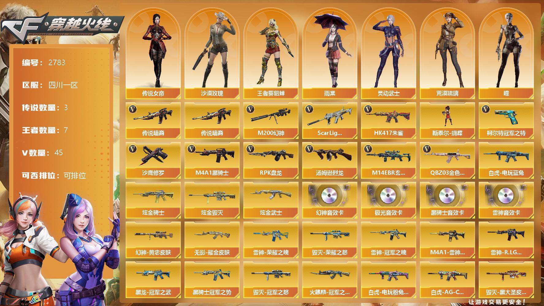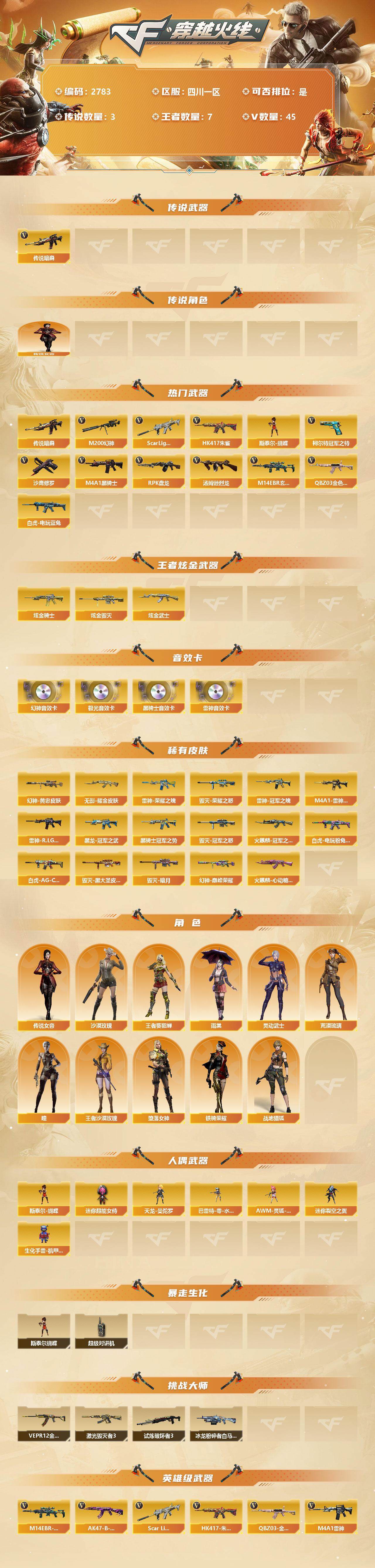 [12959541]四川一区-45V-7王者-3炫金 【传说武器】:传说暗裔*2 【传说角色】:传说女帝 【热门武器】:传说暗裔*2,QBZ03-金色蔷薇,M14EBR-玄武,Scar Light-白虎*2,HK417-朱雀,M200-幻神*2,白虎-电玩蓝兔,柯尔特-冠军之特,M4A1-黑骑士*2,汤姆逊-烈龙,RPK-盘龙,斯泰尔-蝴蝶,沙鹰-修罗 【王者炫金武器】:炫金骑士,炫金毁灭,炫金武士 【音效卡】:M200-幻神音效卡,M4A1-雷神音效卡,M4A1-黑骑士音效卡,Barrett-极光音效卡 【稀有皮肤】:M200-幻神-黄忠皮肤,幻神-巅峰荣耀,白虎-AG-CFPLS20冠军,白虎-电玩粉兔皮肤,雷神-荣耀之魄,M4A1-雷神-CFS 2019,雷神-冠军之魄,雷神-R.LGD-CFPLS18冠军,火麒麟-冠军之心,火麒麟-心动糖果,黑骑士-冠军之势,黑龙-冠军之武*2,毁灭-暗月,毁灭-荣耀之怒,毁灭-冠军之怒,毁灭-黑大圣皮肤,无影耀金皮肤 【角色】:传说女帝,王者-葵-貂蝉,王者沙漠玫瑰,堕落女神,瞳,沙漠玫瑰,雨棠,荒漠琉璃,战地猎狐,铁骑荣耀,灵动武士 【人偶武器】:斯泰尔-蝴蝶,天龙-曼陀罗,巴雷特-零-水下丽影,AWM-灵狐-15周年嘉年华,迷你超能女侍,迷你裂空之翼,生化手雷-机甲核心 【暴走生化】:斯泰尔-蝴蝶,超级对讲机 【挑战大师】:试炼破坏者III,激光毁灭者III*4,VEPR-12-金魔,冰龙粉碎者-白马银枪 【英雄级武器】:Barrett-电竞装甲,柯尔特-电竞装甲*2,尼泊尔-电竞装甲,QBZ03-金色蔷薇,M14EBR-玄武,Scar Light-白虎*2,HK417-朱雀,白虎-电玩蓝兔,无影-神兵利器,M4A1-雷神,M4A1-黑骑士*2,RPK-盘龙,汤姆逊-烈龙,AK47-火麒麟,AN94-超新星,Barrett-毁灭,Barrett-极光,M200-幻神*2,死神-雪域霜狐,AK47-B-常胜将军,M4A1-赤狱骑士,柯尔特-冠军之特,沙鹰-天神*2,沙鹰-修罗,屠龙 【特殊枪械】:蝴蝶斯泰尔+1烈龙,2白虎,2黑骑士,1烈龙,1盘龙,1蝴蝶斯泰尔