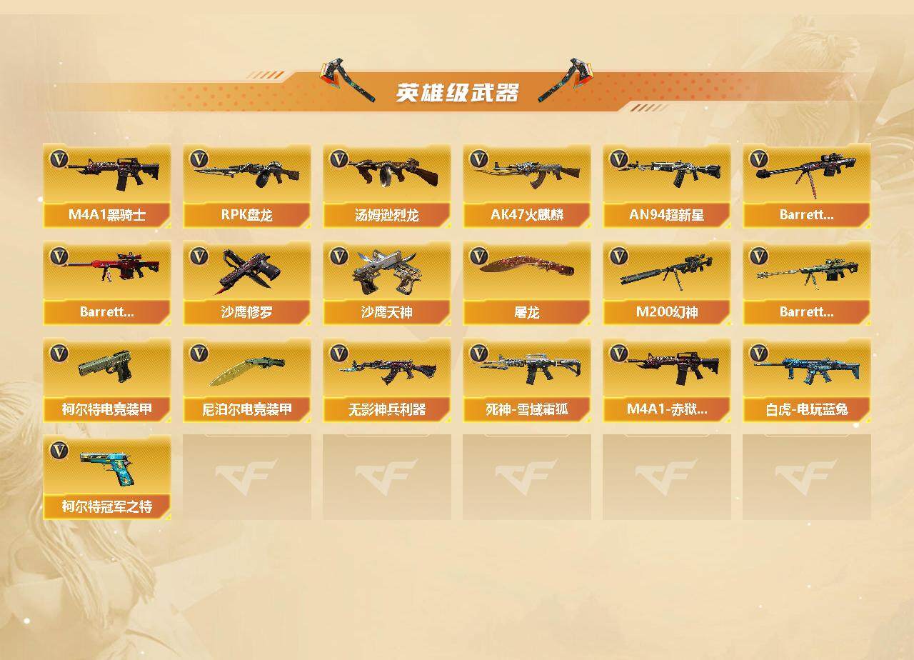 【英雄级武器】:Barrett-电竞装甲,柯尔特-电竞装甲*2,尼泊尔-电竞装甲,QBZ03-金色蔷薇,M14EBR-玄武,Scar Light-白虎*2,HK417-朱雀,白虎-电玩蓝兔,无影-神兵利器,M4A1-雷神,M4A1-黑骑士*2,RPK-盘龙,汤姆逊-烈龙,AK47-火麒麟,AN94-超新星,Barrett-毁灭,Barrett-极光,M200-幻神*2,死神-雪域霜狐,AK47-B-常胜将军,M4A1-赤狱骑士,柯尔特-冠军之特,沙鹰-天神*2,沙鹰-修罗,屠龙