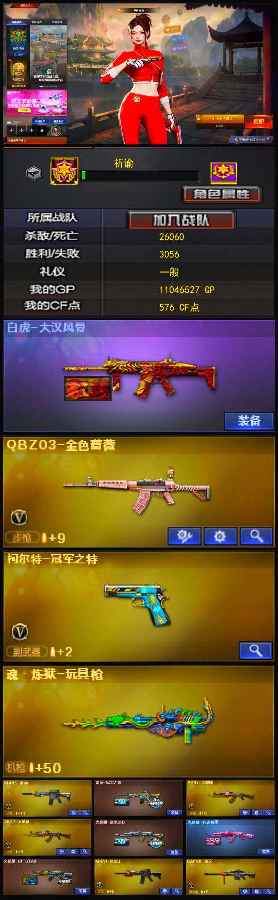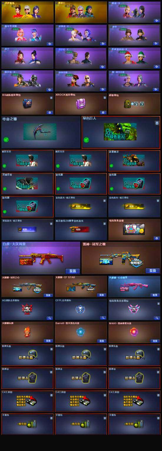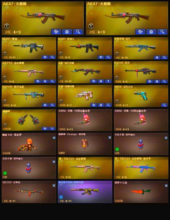 【英雄级武器】:天神-动感闪耀,QBZ03-金色蔷薇,无影-神兵利器,M4A1-雷神,M4A1-黑骑士,AK47-火麒麟*2,Barrett-毁灭,柯尔特-冠军之特,麒麟刺
