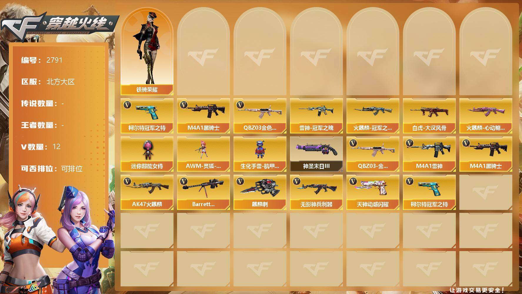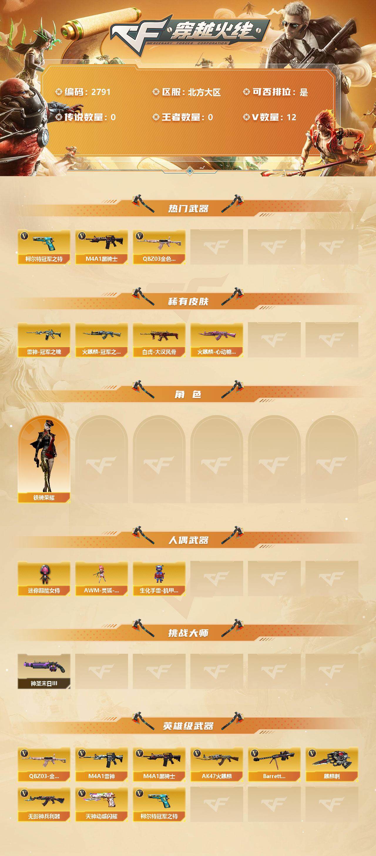 [12959608]北方大区-12V-0王者-0炫金 【热门武器】:QBZ03-金色蔷薇,柯尔特-冠军之特,M4A1-黑骑士 【稀有皮肤】:白虎-大汉风骨,雷神-冠军之魄,火麒麟-冠军之心,火麒麟-心动糖果 【角色】:铁骑荣耀 【人偶武器】:AWM-灵狐-15周年嘉年华*2,迷你超能女侍,生化手雷-机甲核心*2 【挑战大师】:神圣爆裂者-末日III 【英雄级武器】:天神-动感闪耀,QBZ03-金色蔷薇,无影-神兵利器,M4A1-雷神,M4A1-黑骑士,AK47-火麒麟*2,Barrett-毁灭,柯尔特-冠军之特,麒麟刺 【特殊枪械】:1黑骑士