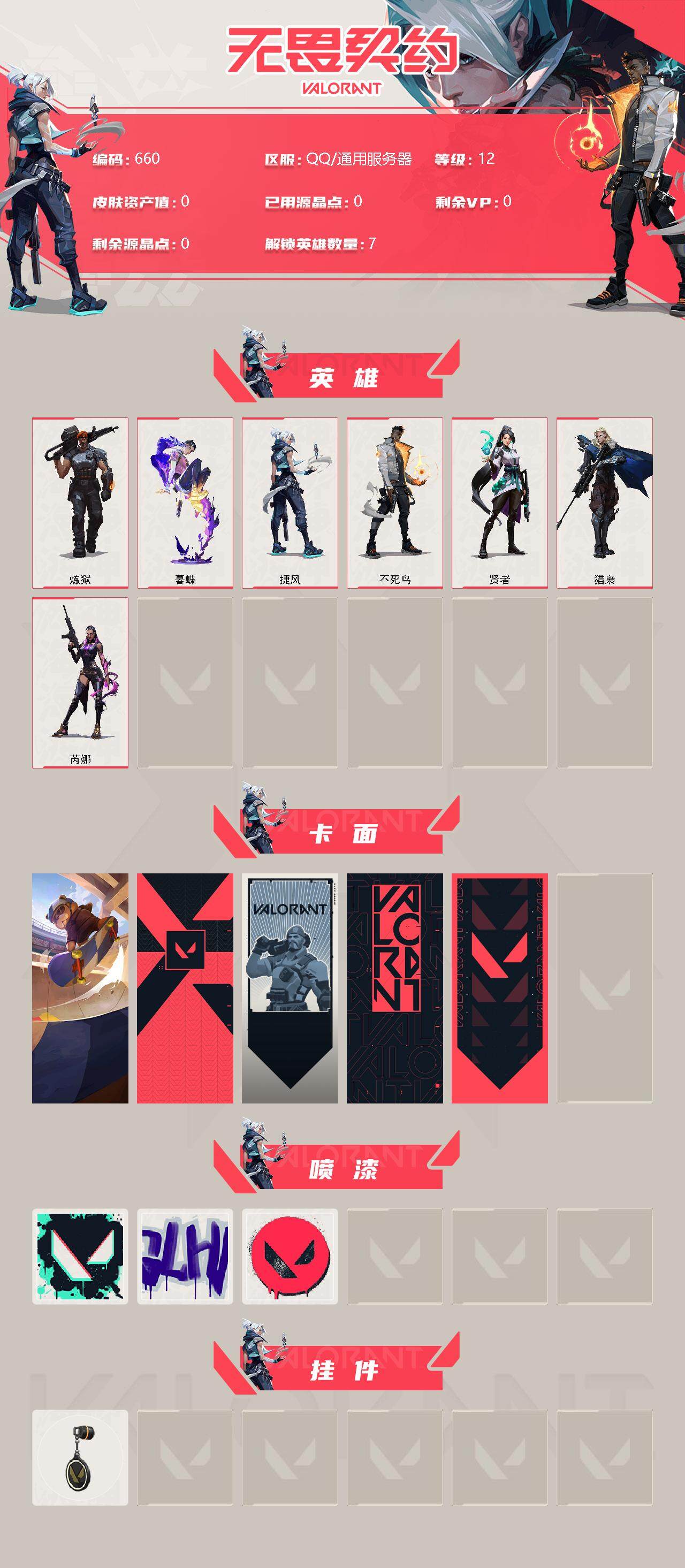 [12959365]【英雄】:炼狱,暮蝶,捷风,不死鸟,贤者,猎枭,芮娜 【卡面】:Clutch 卡面,代号红色 卡面,新兵报到 卡面,V契约 卡面,无畏契约 卡面 【喷漆】:胜利属于无畏契约 喷漆,GLHF 喷漆,无畏契约 喷漆 【挂饰】:无畏契约 纪念币 挂饰