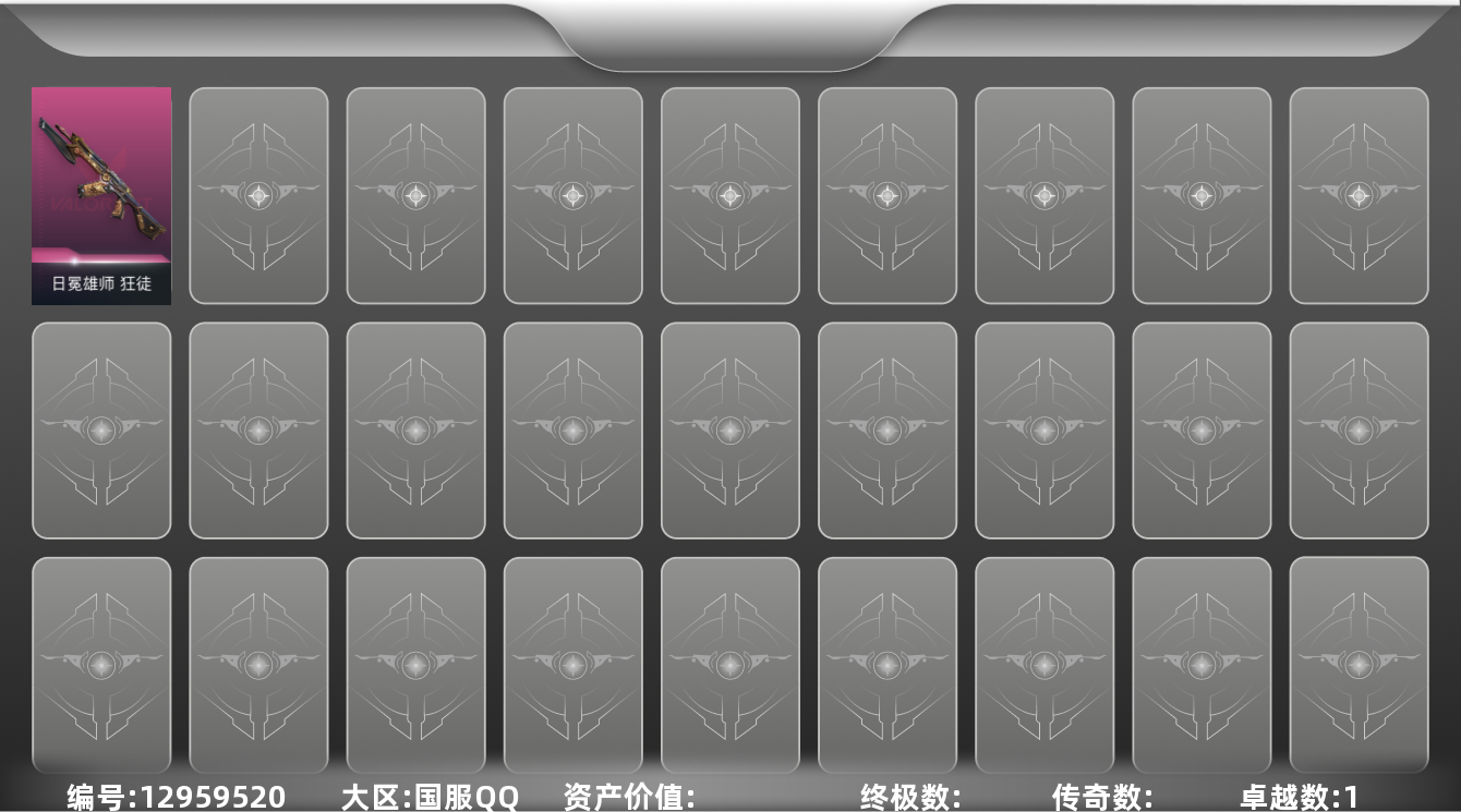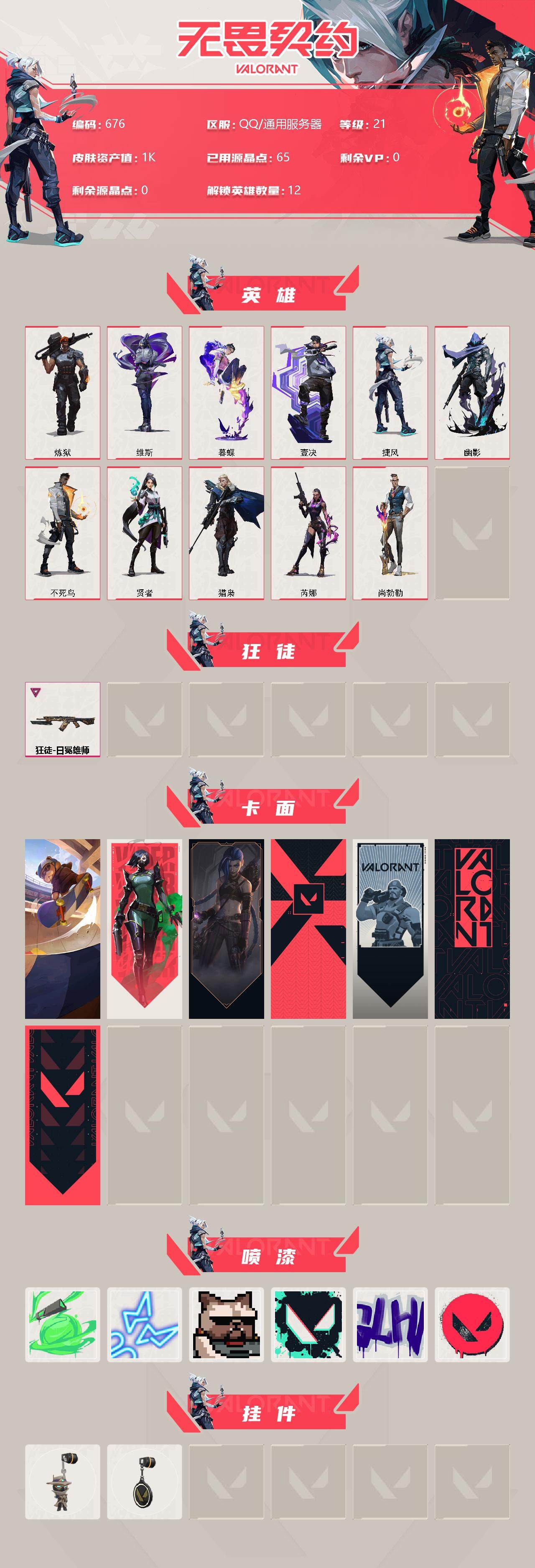 [12959520]【英雄】:炼狱,维斯,暮蝶,壹决,捷风,幽影,不死鸟,贤者,猎枭,芮娜,尚勃勒 【狂徒】:狂徒-日冕雄师 【卡面】:Clutch 卡面,无畏契约:蝰蛇 卡面,《双城之战》金克丝 卡面,代号红色 卡面,新兵报到 卡面,V契约 卡面,无畏契约 卡面 【喷漆】:喜欢哪种毒? 喷漆,霓光四射 喷漆,关门放狗 喷漆,胜利属于无畏契约 喷漆,GLHF 喷漆,无畏契约 喷漆 【挂饰】:无畏契约GO!第一卷 零 挂饰,无畏契约 纪念币 挂饰