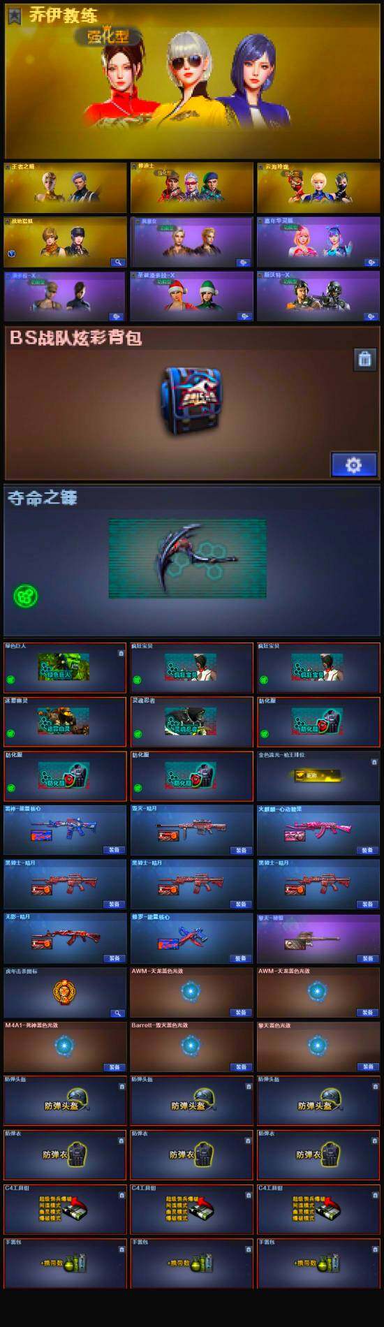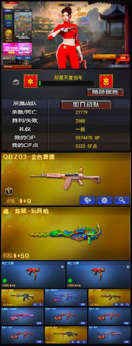 - [13370271]浙江一区-75V-14王者-5炫金 【热门武器】:QBZ03-金色蔷薇,M200-幻神,死亡之眼,M4A1-黑骑士,汤姆逊-烈龙*4,RPK-盘龙*2,加特林-炼狱,沙鹰-修罗*5 【王者炫金武器】:超新星-悦享*3,王者之魄,王者之心,王者之力,王者之魂,炫金火麒麟,炫金骑士*2,炫金无影,炫金雷神 【音效卡】:M4A1-黑骑士音效卡,Barrett-毁灭音效卡 【皮肤】:M200-幻神-黄忠皮肤,幻神-CFS2022,幻神-动感闪耀 皮肤,幻神-曹操 皮肤,QBZ03-荣耀世冠白鲨,金色蔷薇-Heartshot皮肤,雷神-暗月,雷神-星空,M4A1-雷神-CFS 2019,雷神-宇航兔皮肤,火麒麟-轻羽皮肤,火麒麟-白虎,火麒麟-心动糖果,毁灭-暗月*2,毁灭-星空,毁灭-黑曼巴 皮肤,黑龙-能量核心,黑骑士-战神马超,黑骑士-CFS2021,黑骑士-破浪10年皮肤,AWM-天龙-传奇70KG,AWM-天龙-传奇白鲨,屠龙-荣耀之锋 【角色】:电竞教官-云悠悠,王者-瞳-闭月羞花,王者涂鸦,王者晴雅,乔伊教练,暗夜-X,嘉年华灵狐,灵狐者-X,灵狐者-黄金海岸,龙儿,萌儿,潘多拉-X,斯沃特-X,兔囡囡,新灵狐者,影武者-X 【人偶武器】:Barrett-夜玫瑰 【暴走生化】:死亡之眼,超级对讲机 【挑战大师】:冰龙粉碎者-白马银枪,阐释者III 【英雄级武器】:M4A1-千变,AK47-火麒麟*4,M4A1-黑龙,M4A1-雷神*4,M4A1-黑骑士,AK47-黑武士*6,AN94-超新星,M4A1-武圣,M4A1-龙血,QBZ03-金色蔷薇,QBZ-03-王者蔷薇-觉醒版,AWM-天龙,Barrett-毁灭,Barrett-极光,AWM-裁决,M200-幻神,Barrett-金色蔷薇,王者之决-觉醒版,RPK-盘龙*2,加特林-炼狱,汤姆逊-烈龙*4,AA-12-雷霆,沙鹰-修罗*5,沙鹰-天神,柯尔特-竞技荣光*2,天神-动感闪耀,屠龙*2,麒麟刺,擎天-竞技荣光,王者之啸-觉醒版*2,高爆手雷-雷霆,高爆手雷-幻灵,高爆手雷-竞技荣光*6,手雷-动感闪耀,闪光弹-雷霆,闪光弹-幻灵,闪光弹-竞技荣光*6,烟雾弹-雷霆,烟雾弹-竞技荣光*6 【道具】:CFS限定背包,EDG炫彩背包,云山科技背包,炫彩背包,绿色巨人,灵魂忍者,迷雾幽灵,夺命之镰,防化服*