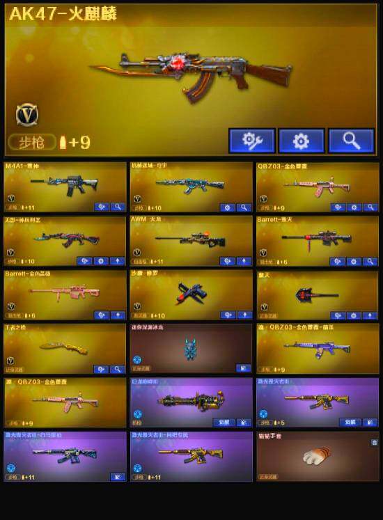 【英雄级武器】:QBZ03-金色蔷薇,无影-神兵利器,M4A1-雷神,AK47-火麒麟,AWM-天龙,Barrett-毁灭,AWM-昌龙,M4A1-赤狱骑士,沙鹰-修罗,擎天