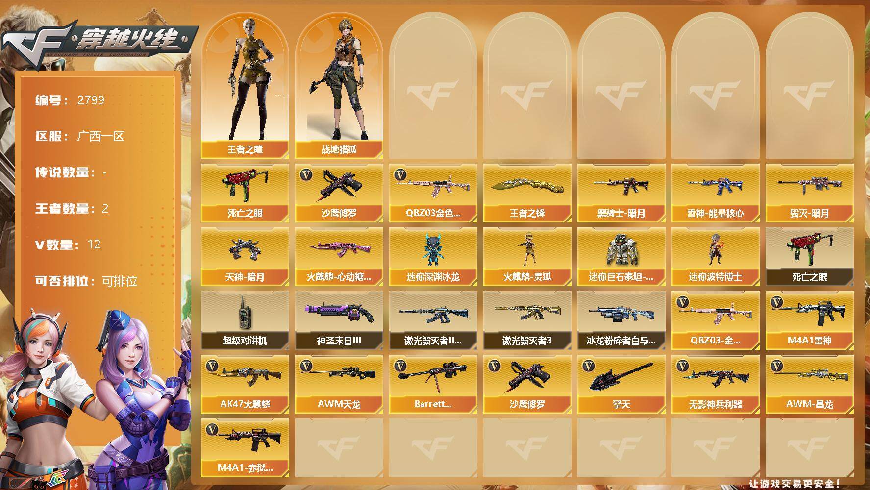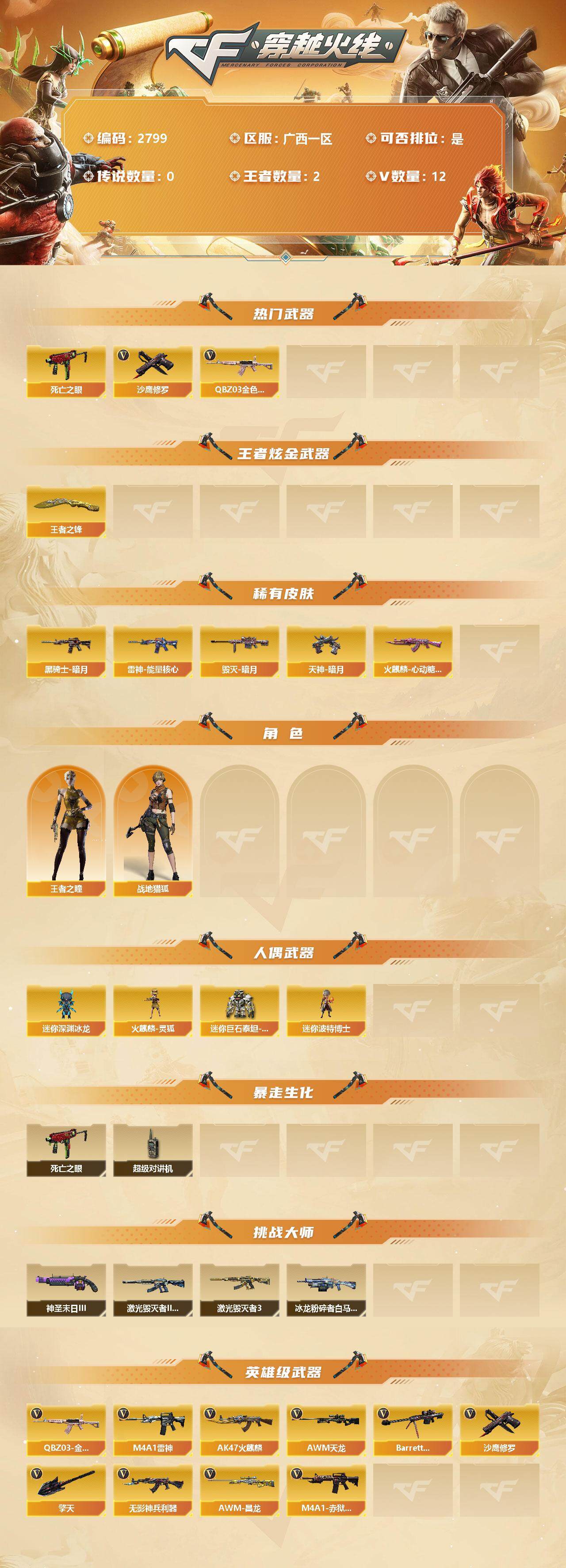 [12959649]广西一区-12V-2王者-0炫金 【热门武器】:QBZ03-金色蔷薇,死亡之眼*2,沙鹰-修罗 【王者炫金武器】:王者之锋 【稀有皮肤】:雷神-能量核心,火麒麟-心动糖果,黑骑士-暗月*3,毁灭-暗月,天神-暗月*4 【角色】:王者之瞳,战地猎狐 【人偶武器】:火麒麟-灵狐,迷你深渊冰龙,迷你巨石泰坦-魔花研究所,迷你波特博士 【暴走生化】:死亡之眼*2,超级对讲机 【挑战大师】:神圣爆裂者-末日III,激光毁灭者III,激光毁灭者III-白马银枪,冰龙粉碎者-白马银枪 【英雄级武器】:QBZ03-金色蔷薇,无影-神兵利器,M4A1-雷神,AK47-火麒麟,AWM-天龙,Barrett-毁灭,AWM-昌龙,M4A1-赤狱骑士,沙鹰-修罗,擎天 【特殊枪械】: