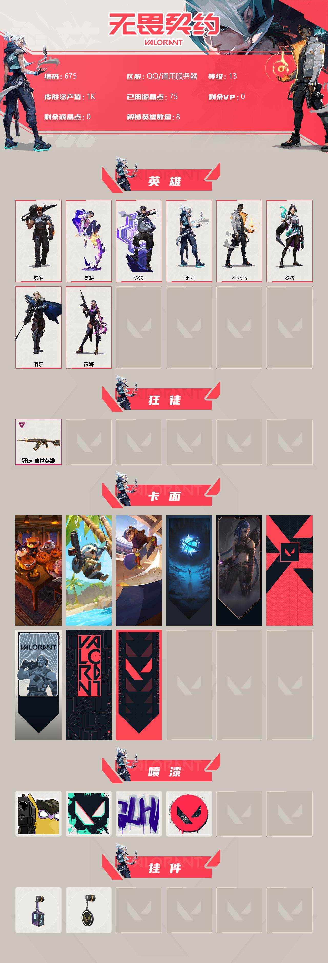 [12959515]【英雄】:炼狱,暮蝶,壹决,捷风,不死鸟,贤者,猎枭,芮娜 【狂徒】:狂徒-盖世英雄 【卡面】:南瓜盛典 卡面,树懒大作战 卡面,Clutch 卡面,无垠星环 卡面,《双城之战》金克丝 卡面,代号红色 卡面,新兵报到 卡面,V契约 卡面,无畏契约 卡面 【喷漆】:放下武器 喷漆,胜利属于无畏契约 喷漆,GLHF 喷漆,无畏契约 喷漆 【挂饰】:动力机箱 挂饰,无畏契约 纪念币 挂饰
