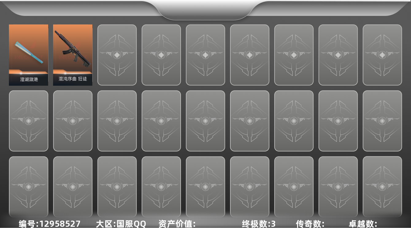 [12958527]【英雄】:炼狱,维斯,暮蝶,捷风,幽影,不死鸟,贤者,猎枭,芮娜,尚勃勒,黑梦 【近战 武器】:近战武器-澄湖潋滟 【狂徒】:狂徒-2025全球冠军赛,狂徒-混沌序曲 【卡面】:《双城之战》金克丝 卡面,代号红色 卡面,新兵报到 卡面,V契约 卡面,无畏契约 卡面 【喷漆】:霓光四射 喷漆,关门放狗 喷漆,无畏契约GO!第一卷:奇乐 喷漆,胜利属于无畏契约 喷漆,GLHF 喷漆,无畏契约 喷漆 【挂饰】:无畏契约GO!第一卷 零 挂饰,无畏契约 纪念币 挂饰
