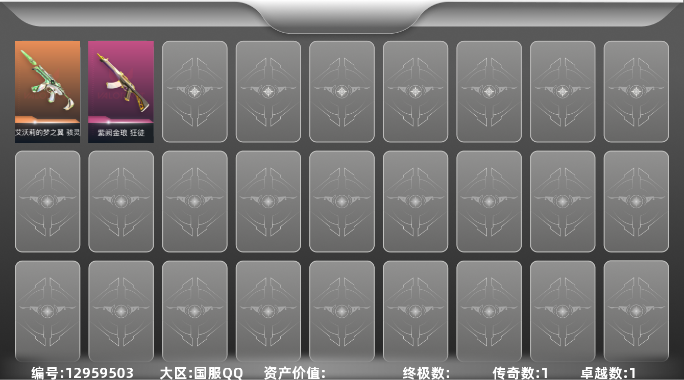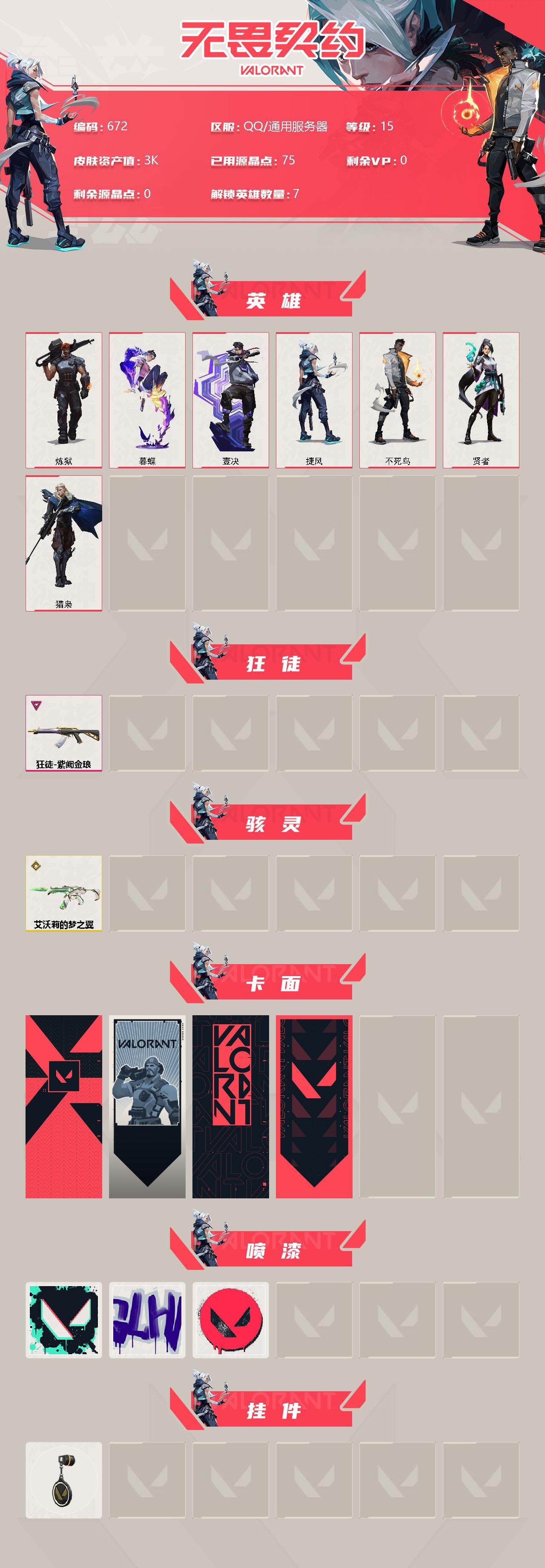 [12959503]【英雄】:炼狱,暮蝶,壹决,捷风,不死鸟,贤者,猎枭 【狂徒】:狂徒-紫阙金琅 【骇灵】:骇灵-艾沃莉的梦之翼 【卡面】:代号红色 卡面,新兵报到 卡面,V契约 卡面,无畏契约 卡面 【喷漆】:胜利属于无畏契约 喷漆,GLHF 喷漆,无畏契约 喷漆 【挂饰】:无畏契约 纪念币 挂饰