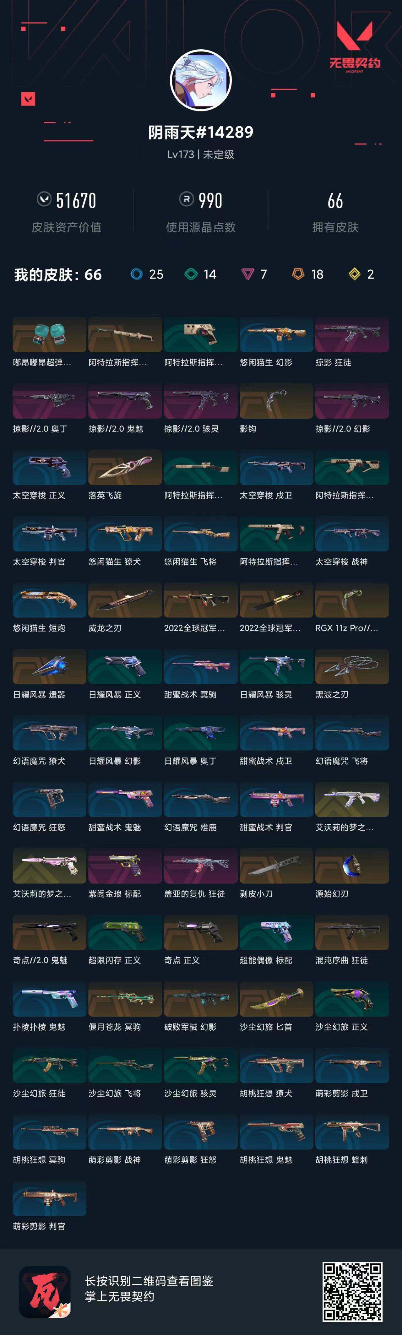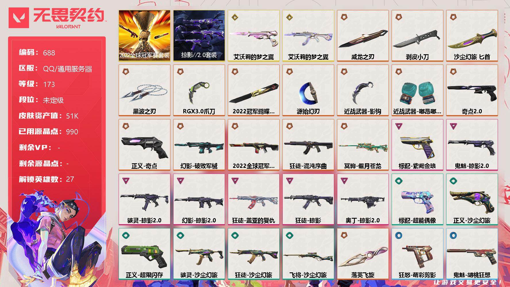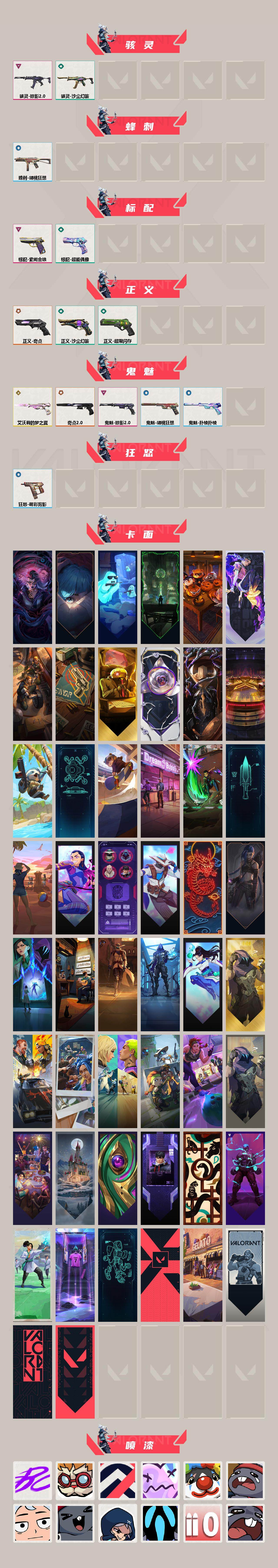 [12959749]【套装】:2022全球冠军赛套装,掠影//2.0套装 【英雄】:幻棱,炼狱,维斯,暮蝶,钛狐,壹决,铁臂,捷风,雷兹,幽影,不死鸟,贤者,猎枭,蝰蛇,零,芮娜,奇乐,尚勃勒,霓虹,斯凯,夜露,星礈,K/O,海神,盖可,黑梦,钢锁 【近战 武器】:近战武器-2022全球冠军赛 蝴蝶刀,近战武器-嘟昂嘟昂超弹力水球拳套,近战武器-影钩,近战武器-剥皮小刀,近战武器-RGX 11z Pro//3.0 爪刀,近战武器-黑波之刃,近战武器-落英飞旋,近战武器-威龙之刃,近战武器-源始幻刃,近战武器-沙尘幻旅 匕首 【狂徒】:狂徒-艾沃莉的梦之翼,狂徒-混沌序曲,狂徒-掠影,狂徒-盖亚的复仇,狂徒-沙尘幻旅 【幻影】:幻影-2022全球冠军赛,幻影-破败军械,幻影-掠影//2.0 【戍卫】:戍卫-萌彩剪影 【獠犬】:獠犬-胡桃狂想 【冥驹】:冥驹-偃月苍龙,冥驹-胡桃狂想 【飞将】:飞将-沙尘幻旅 【战神】:战神-萌彩剪影 【奥丁】:奥丁-掠影//2.0 【判官】:判官-萌彩剪影 【骇灵】:骇灵-掠影//2.0,骇灵-沙尘幻旅 【蜂刺】:蜂刺-胡桃狂想 【标配】:标配-紫阙金琅,标配-超能偶像 【正义】:正义-奇点,正义-超限闪存,正义-沙尘幻旅 【鬼魅】:鬼魅-艾沃莉的梦之翼,鬼魅-奇点//2.0,鬼魅-掠影//2.0,鬼魅-胡桃狂想,鬼魅-扑棱扑棱 【狂怒】:狂怒-萌彩剪影 【卡面】:分崩离析 卡面,《双城之战》拥抱 卡面,精灵大战 卡面,欢迎来到底城 卡面,南瓜盛典 卡面,无畏契约:暮蝶 卡面,修车达人 卡面,正义的化身 卡面,终章:生意人麦宝 卡面,铁之华 卡面,时间到 卡面,最高舞台 卡面,树懒大作战 卡面,声感陷阱设计图 卡面,Clutch 卡面,梦幻奶茶 卡面,源能反应 卡面,零点嗅探设计图 卡面,沙雕爆能器 卡面,无畏契约GO!第一卷:芮娜 卡面,清除名单 卡面,无畏契约GO!第一卷:零 卡面,龍记 卡面,《双城之战》金克丝 卡面,蝰蛇vs幽影 卡面,完美调谐 卡面 ,没有什么能逃过我的眼睛 卡面,暗枪 卡面,无畏契约GO!第一卷:贤者 卡面,终章:黑影先生的咖啡! 卡面,铁臂vs雷兹 卡面,纪念照 P2 卡面,钢锁vs盖可 卡面,别冒尖 卡面,一击全倒 卡面,黑影先生的咖啡! 卡面,天台狂欢 卡面,胡桃狂想 卡面,沙尘幻旅 卡面,壹决工牌 卡面,萌彩剪影 卡