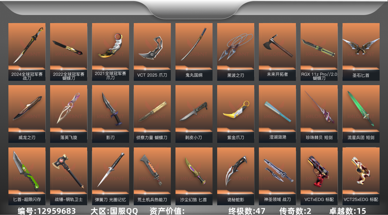 [12959683]【套装】:2024全球冠军赛套装,2022全球冠军赛套装,2021全球冠军赛套装,VCT 2025 赛季套装,西部未来套装,塑水宗套装,千灵华绽套装,VCTxEDG 队伍套装,掠影套装,耀鳞威龙套装 【英雄】:幻棱,炼狱,维斯,暮蝶,钛狐,壹决,铁臂,捷风,雷兹,幽影,不死鸟,贤者,猎枭,蝰蛇,零,芮娜,奇乐,尚勃勒,霓虹,斯凯,夜露,星礈,K/O,海神,盖可,黑梦,钢锁 【近战 武器】:近战武器-2024全球冠军赛 战刀,近战武器-2022全球冠军赛 蝴蝶刀,近战武器-2021全球冠军赛 爪刀,近战武器-RGX 11z Pro//2.0 蝴蝶刀,近战武器-侦察力量 蝴蝶刀,近战武器-剥皮小刀,近战武器-VCT 2025 爪刀,近战武器-紫金爪刀,近战武器-黑波之刃,近战武器-落英飞旋,近战武器-威龙之刃,近战武器-澄湖潋滟,近战武器-鬼丸国纲,近战武器-未来开拓者,近战武器-珍珠棘贝 短剑,近战武器-流星兵团 短剑,近战武器-超限闪存 匕首,近战武器-钢轨卫士 战锤,近战武器-光圈记忆 弹簧刀,近战武器-荒土机兵 热能刀,近战武器-沙尘幻旅 匕首,近战武器-圣石匕首,近战武器-影刃,近战武器-诡秘蛇影 军刀,近战武器-神圣领域 战刀 【狂徒】:狂徒-艾沃莉的梦之翼,狂徒-2021全球冠军赛,狂徒-塑水宗,狂徒-掠影,狂徒-盖亚的复仇,狂徒-耀鳞威龙,狂徒-紫阙金琅,狂徒-钢轨卫士,狂徒-荒土机兵,狂徒-流星兵团,狂徒-沙尘幻旅,狂徒-诡秘蛇影 【幻影】:幻影-781-A协议,幻影-2022全球冠军赛,幻影-2024全球冠军赛,幻影-砰砰X特攻队,幻影-千灵华绽,幻影-西部未来,幻影-侦察力量,幻影-超限闪存,幻影-珍珠棘贝,幻影-神圣领域,幻影-纳米打击,幻影-战术小伙伴,幻影-末日之翼,幻影-西部未来 【戍卫】:戍卫-掠影,戍卫-钢轨卫士,戍卫-珍珠棘贝,戍卫-浮光跃金,戍卫-萌彩剪影,戍卫-逆冲蛮牛,戍卫-战术熊与伙伴们,戍卫-月球哨兵,戍卫-折光棱晶 【獠犬】:獠犬-黯夜怪谈,獠犬-神圣领域,獠犬-复古浪潮,獠犬-胡桃狂想,獠犬-模拟赫兹,獠犬-逆冲蛮牛,獠犬-战术小伙伴 【冥驹】:冥驹-归零者,冥驹-千灵华绽,冥驹-掠影,冥驹-起源,冥驹-荒土机兵,冥驹-复古浪潮,冥驹-胡桃狂想,冥驹-模拟赫兹,冥驹-星云暗涌 【飞将】:飞将-塑水宗,飞将-西部未来,飞