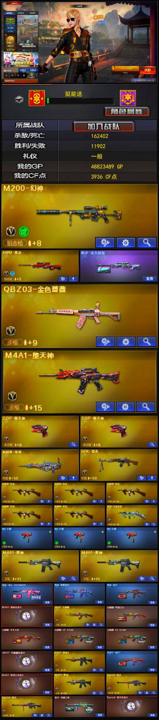 【热门武器】:QBZ03-金色蔷薇,M200-幻神,死亡之眼*3,C.A.T,M4A1-黑骑士,汤姆逊-烈龙*5,RPK-盘龙,加特林-炼狱,火麒麟-绝迹,COP-堕天神*2,沙鹰-修罗*2