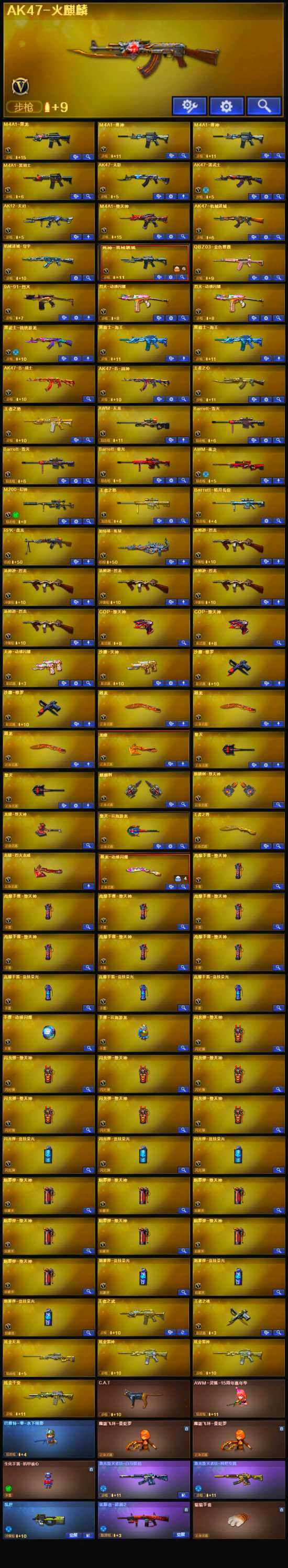 【英雄级武器】:高爆手雷-竞技荣光*3,烟雾弹-竞技荣光*3,闪光弹-竞技荣光*3,M4A1-堕天神,COP-堕天神*2,麒麟刺-堕天神,龙啸-堕天神,烈火-动感闪耀*2,天神-动感闪耀,屠龙-动感闪耀,手雷-动感闪耀,QBZ03-金色蔷薇,M4A1-雷神*2,M4A1-黑龙,M4A1-黑骑士,RPK-盘龙,加特林-炼狱,汤姆逊-烈龙*5,AK47-无影,AK47-火麒麟,AK47-黑武士,AK12-天启,AWM-天龙,Barrett-毁灭*2,Barrett-极光,AWM-裁决,AK47-机械迷城,M200-幻神,黑武士-锦绣游龙,黑骑士-海王*2,死神-雪域霜狐,AK47-B-战神,沙鹰-天神,沙鹰-修罗*2,麒麟刺,擎天*2,龙啸,屠龙*3,擎天-云海游龙
