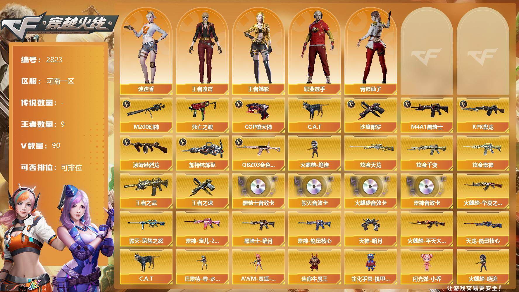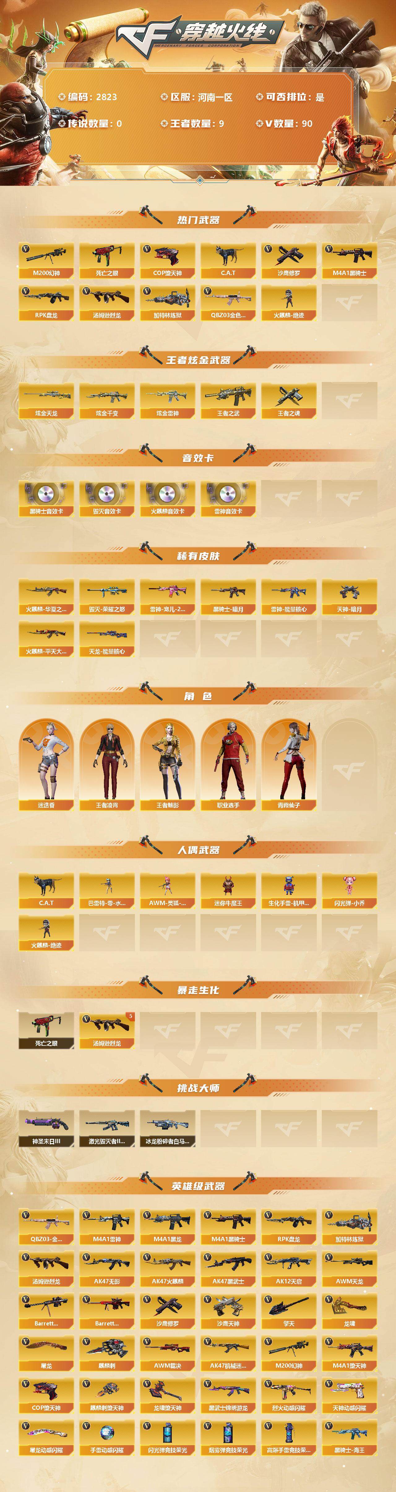 [12959871]河南一区-90V-9王者-4炫金 【热门武器】:QBZ03-金色蔷薇,M200-幻神,死亡之眼*3,C.A.T,M4A1-黑骑士,汤姆逊-烈龙*5,RPK-盘龙,加特林-炼狱,火麒麟-绝迹,COP-堕天神*2,沙鹰-修罗*2 【王者炫金武器】:炫金天龙,炫金千变,炫金雷神*2,王者之武,王者之魂 【音效卡】:AK47-火麒麟音效卡,M4A1-雷神音效卡,M4A1-黑骑士音效卡,Barrett-毁灭音效卡 【稀有皮肤】:雷神-能量核心,雷神-宠儿-2019MVP,火麒麟-华夏之心,火麒麟-平天大圣,黑骑士-暗月,毁灭-荣耀之怒,天龙-能量核心,天神-暗月*3 【角色】:王者凌霄,王者-魅影,迷迭香,职业选手,青霞仙子 【人偶武器】:火麒麟-绝迹,巴雷特-零-水下丽影,AWM-灵狐-15周年嘉年华,C.A.T,迷你牛魔王,生化手雷-机甲核心,闪光弹-小乔 【暴走生化】:死亡之眼*3 【挑战大师】:神圣爆裂者-末日III,激光毁灭者III-白马银枪,冰龙粉碎者-白马银枪 【英雄级武器】:高爆手雷-竞技荣光*3,烟雾弹-竞技荣光*3,闪光弹-竞技荣光*3,M4A1-堕天神,COP-堕天神*2,麒麟刺-堕天神,龙啸-堕天神,烈火-动感闪耀*2,天神-动感闪耀,屠龙-动感闪耀,手雷-动感闪耀,QBZ03-金色蔷薇,M4A1-雷神*2,M4A1-黑龙,M4A1-黑骑士,RPK-盘龙,加特林-炼狱,汤姆逊-烈龙*5,AK47-无影,AK47-火麒麟,AK47-黑武士,AK12-天启,AWM-天龙,Barrett-毁灭*2,Barrett-极光,AWM-裁决,AK47-机械迷城,M200-幻神,黑武士-锦绣游龙,黑骑士-海王*2,死神-雪域霜狐,AK47-B-战神,沙鹰-天神,沙鹰-修罗*2,麒麟刺,擎天*2,龙啸,屠龙*3,擎天-云海游龙 【特殊枪械】:1黑骑士,5烈龙,1盘龙,1炼狱