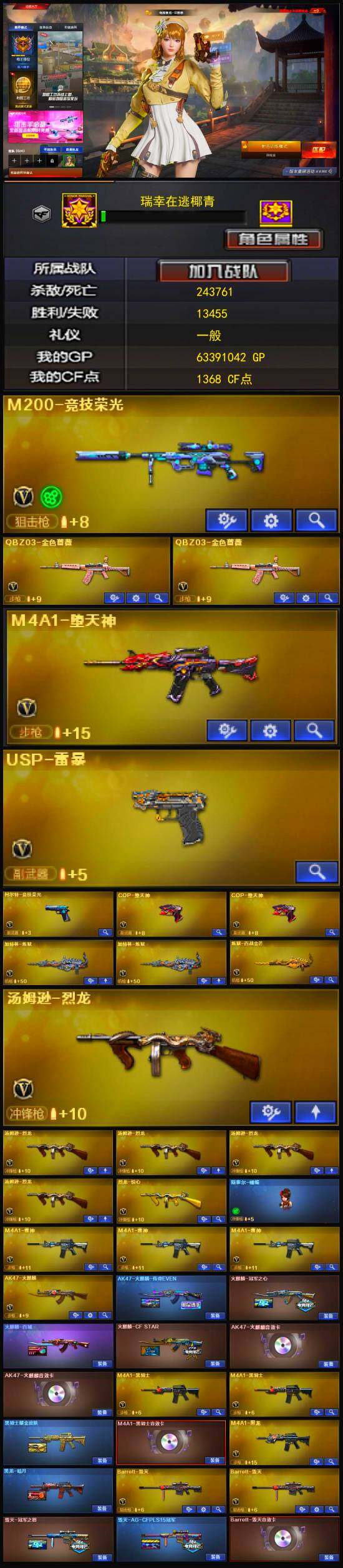 【热门武器】:QBZ03-金色蔷薇*2,M200-竞技荣光,金色小号,C.A.T,M4A1-黑骑士*2,汤姆逊-烈龙*5,加特林-炼狱*2,斯泰尔-蝴蝶,USP-雷暴,COP-堕天神*2,沙鹰-修罗*2