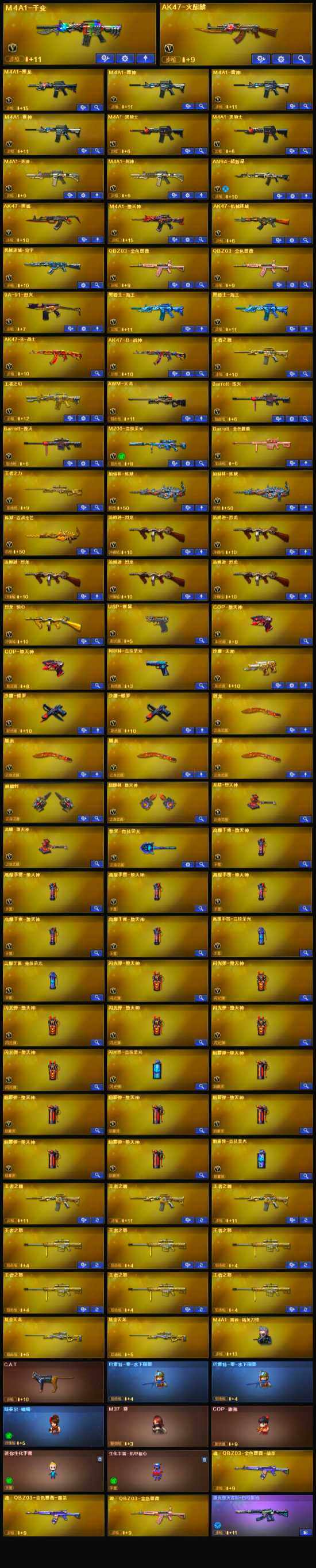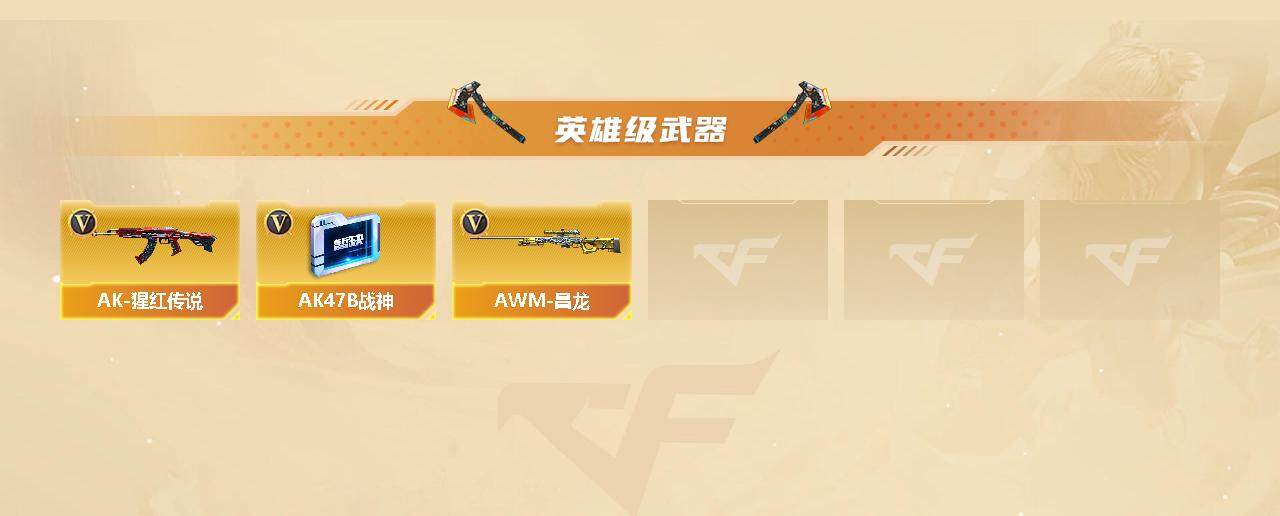【英雄级武器】:M200-竞技荣光,柯尔特-竞技荣光,擎天-竞技荣光,高爆手雷-竞技荣光*2,烟雾弹-竞技荣光,闪光弹-竞技荣光,M4A1-堕天神,COP-堕天神*2,麒麟刺-堕天神,龙啸-堕天神*2,USP-雷暴,QBZ03-金色蔷薇*2,M4A1-雷神*3,M4A1-黑龙,M4A1-黑骑士*2,M4A1-死神*2,加特林-炼狱*2,汤姆逊-烈龙*5,AK47-火麒麟,AN94-超新星,AWM-天龙,Barrett-毁灭*2,AK47-机械迷城,AK47-黑鲨,M4A1-千变,黑骑士-海王*2,AK-47-猩红传说*25,AK47-B-战神,AWM-昌龙,沙鹰-天神,沙鹰-修罗*2,麒麟刺,屠龙*4