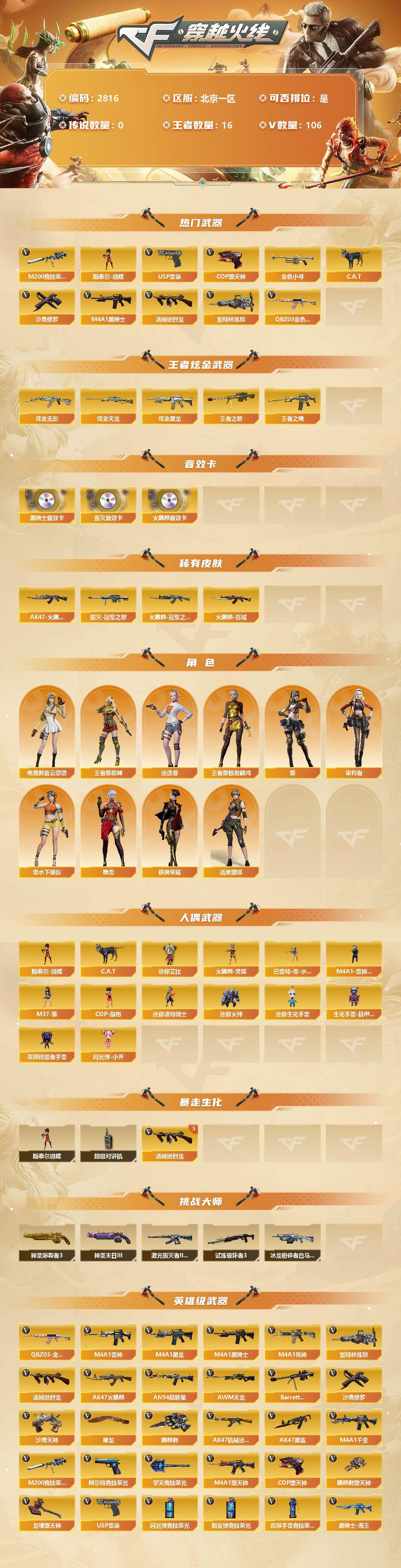 [12959823]北京一区-106V-16王者-6炫金 【热门武器】:QBZ03-金色蔷薇*2,M200-竞技荣光,金色小号,C.A.T,M4A1-黑骑士*2,汤姆逊-烈龙*5,加特林-炼狱*2,斯泰尔-蝴蝶,USP-雷暴,COP-堕天神*2,沙鹰-修罗*2 【王者炫金武器】:炫金无影*2,炫金天龙*2,炫金黑龙*2,王者之怒*6,王者之魄*3 【音效卡】:AK47-火麒麟音效卡*2,M4A1-黑骑士音效卡,Barrett-毁灭音效卡 【稀有皮肤】:火麒麟-冠军之心,AK47-火麒麟-传奇EVEN,火麒麟-百城,毁灭-冠军之怒 【角色】:王者-葵-貂蝉,王者葵-惊若翩鸿,零-水下丽影,审判者,葵,迷迭香,电竞教官-云悠悠,战地猎狐,蜀雪,铁骑荣耀 【人偶武器】:斯泰尔-蝴蝶,火麒麟-灵狐,巴雷特-零-水下丽影*2,M4A1-雷神-精英刀锋,M37-葵,COP-旗袍,C.A.T,迷你艾比,迷你波特博士,迷你火种,迷你生化手雷,生化手雷-机甲核心,深渊终结者手雷,闪光弹-小乔 【暴走生化】:斯泰尔-蝴蝶,超级对讲机 【挑战大师】:神圣爆裂者III,神圣爆裂者-末日III,试炼破坏者III,激光毁灭者III-白马银枪,冰龙粉碎者-白马银枪 【英雄级武器】:M200-竞技荣光,柯尔特-竞技荣光,擎天-竞技荣光,高爆手雷-竞技荣光*2,烟雾弹-竞技荣光,闪光弹-竞技荣光,M4A1-堕天神,COP-堕天神*2,麒麟刺-堕天神,龙啸-堕天神*2,USP-雷暴,QBZ03-金色蔷薇*2,M4A1-雷神*3,M4A1-黑龙,M4A1-黑骑士*2,M4A1-死神*2,加特林-炼狱*2,汤姆逊-烈龙*5,AK47-火麒麟,AN94-超新星,AWM-天龙,Barrett-毁灭*2,AK47-机械迷城,AK47-黑鲨,M4A1-千变,黑骑士-海王*2,AK-47-猩红传说*25,AK47-B-战神,AWM-昌龙,沙鹰-天神,沙鹰-修罗*2,麒麟刺,屠龙*4 【特殊枪械】:蝴蝶斯泰尔+5烈龙,2黑骑士,5烈龙,2炼狱,1蝴蝶斯泰尔