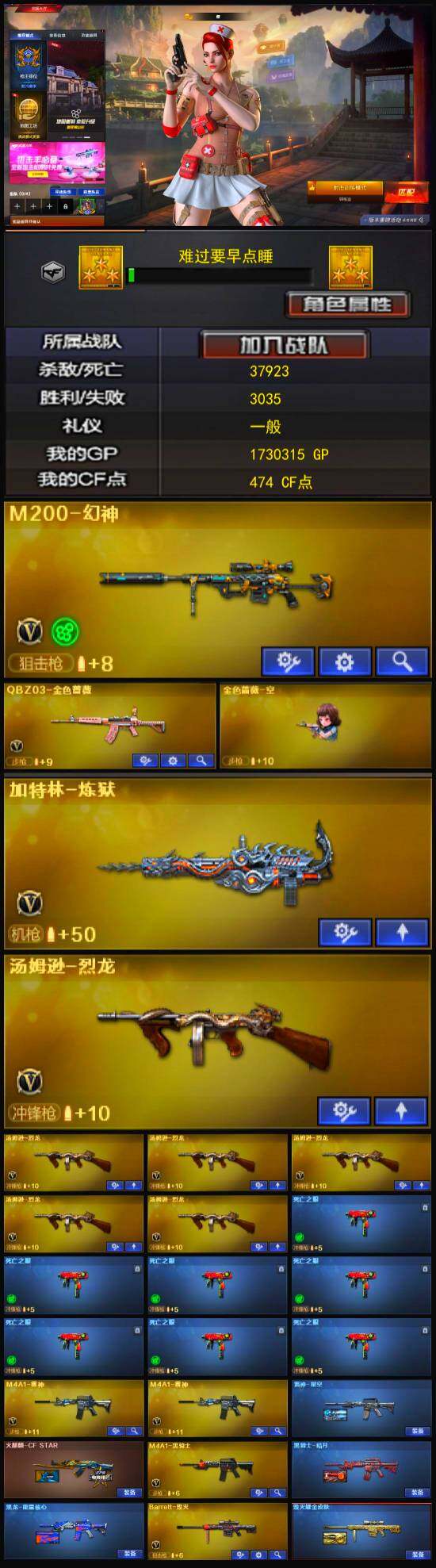【热门武器】:QBZ03-金色蔷薇,M200-幻神,死亡之眼*7,M4A1-黑骑士,汤姆逊-烈龙*6,加特林-炼狱,金色蔷薇-空,沙鹰-修罗*3