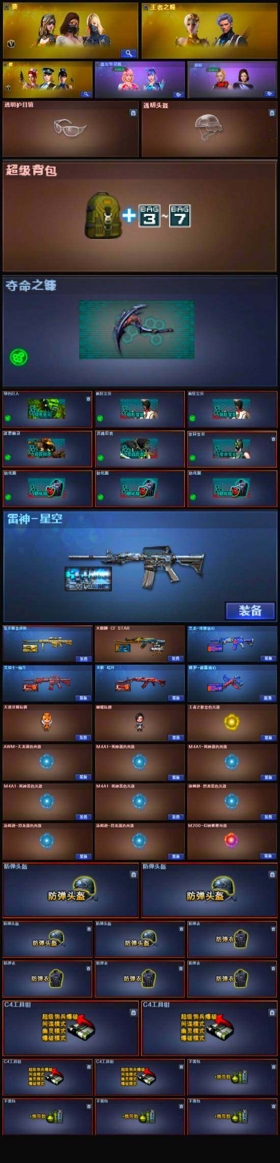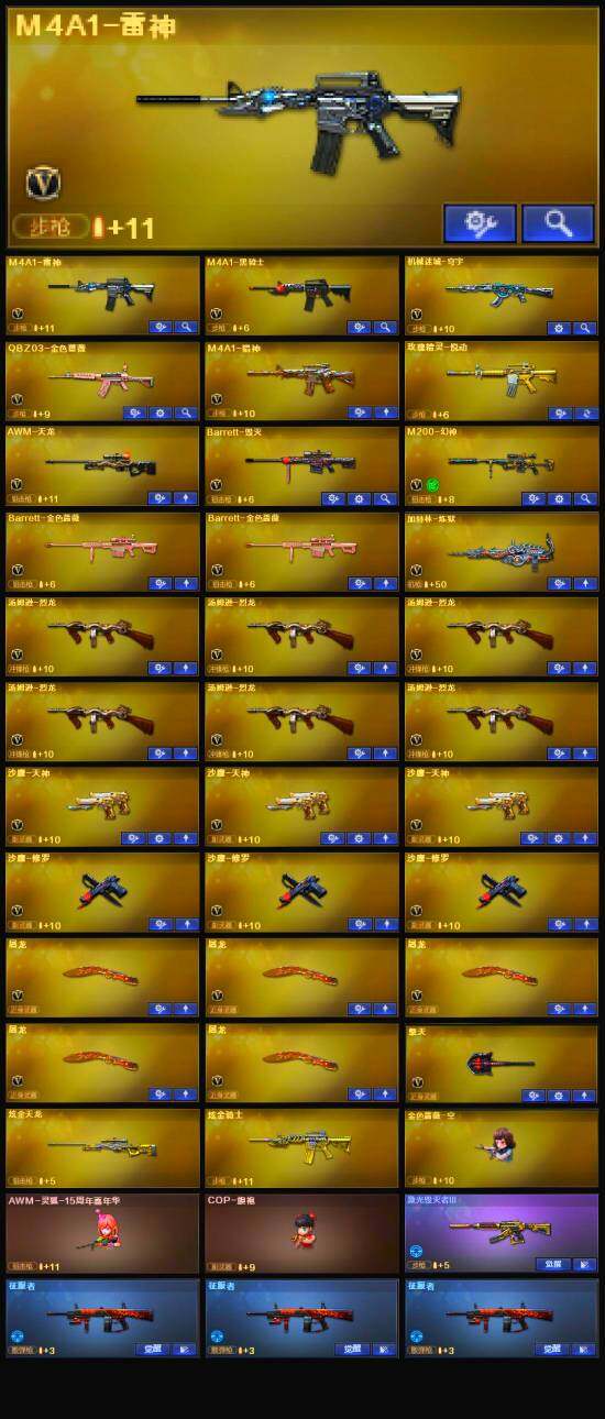 【英雄级武器】:M4A1-雷神*2,M4A1-黑骑士,QBZ03-金色蔷薇,M4A1-猎神,AWM-天龙,Barrett-毁灭,M200-幻神,加特林-炼狱,汤姆逊-烈龙*6,沙鹰-修罗*3,沙鹰-天神*3,屠龙*5,擎天