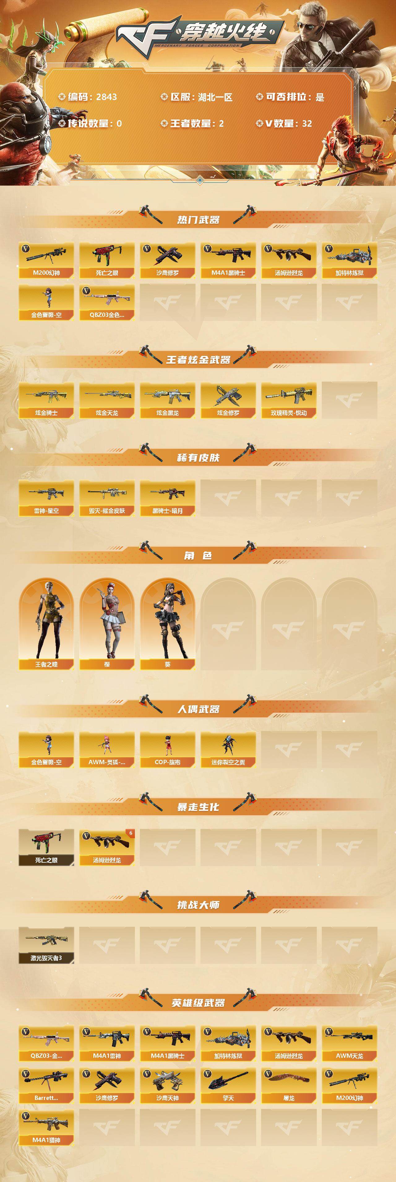 [12959970]湖北一区-32V-2王者-5炫金 【热门武器】:QBZ03-金色蔷薇,M200-幻神,死亡之眼*7,M4A1-黑骑士,汤姆逊-烈龙*6,加特林-炼狱,金色蔷薇-空,沙鹰-修罗*3 【王者炫金武器】:玫瑰精灵-悦动,炫金骑士,炫金天龙,炫金黑龙,炫金修罗*2 【稀有皮肤】:雷神-星空,黑骑士-暗月,毁灭耀金皮肤 【角色】:葵,樱,王者之瞳 【人偶武器】:金色蔷薇-空,AWM-灵狐-15周年嘉年华,COP-旗袍,迷你裂空之翼 【暴走生化】:死亡之眼*7 【挑战大师】:激光毁灭者III 【英雄级武器】:M4A1-雷神*2,M4A1-黑骑士,QBZ03-金色蔷薇,M4A1-猎神,AWM-天龙,Barrett-毁灭,M200-幻神,加特林-炼狱,汤姆逊-烈龙*6,沙鹰-修罗*3,沙鹰-天神*3,屠龙*5,擎天 【特殊枪械】:1黑骑士,6烈龙,1炼狱