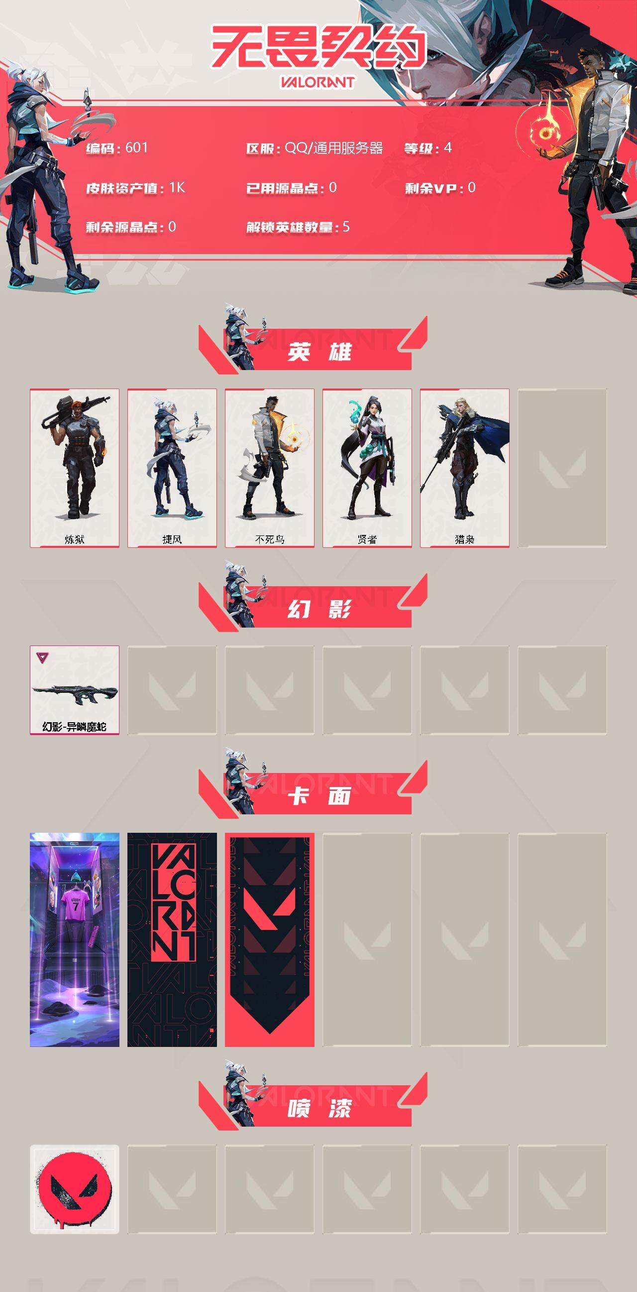 [12958917]【英雄】:炼狱,捷风,不死鸟,贤者,猎枭 【幻影】:幻影-异鳞魔蛇 【卡面】:"Luie" 卡面,V契约 卡面,无畏契约 卡面 【喷漆】:无畏契约 喷漆