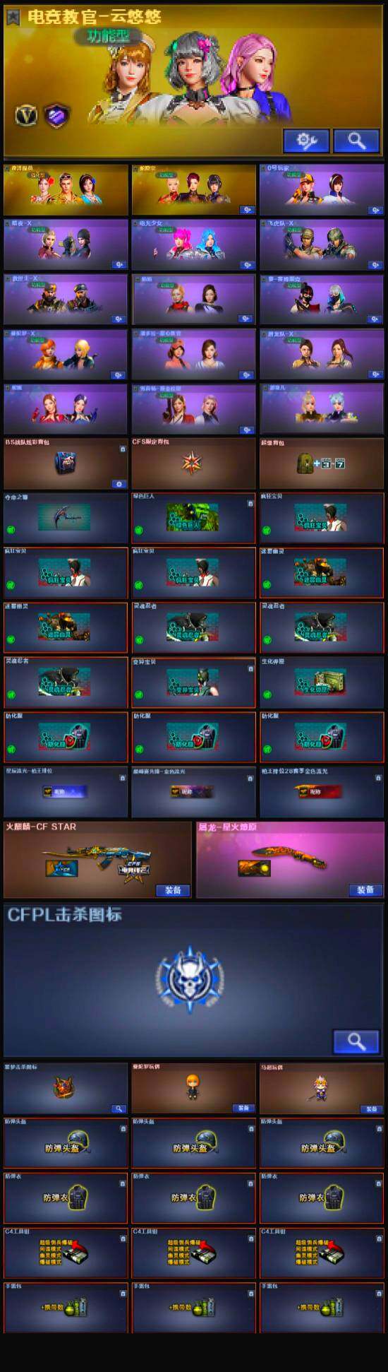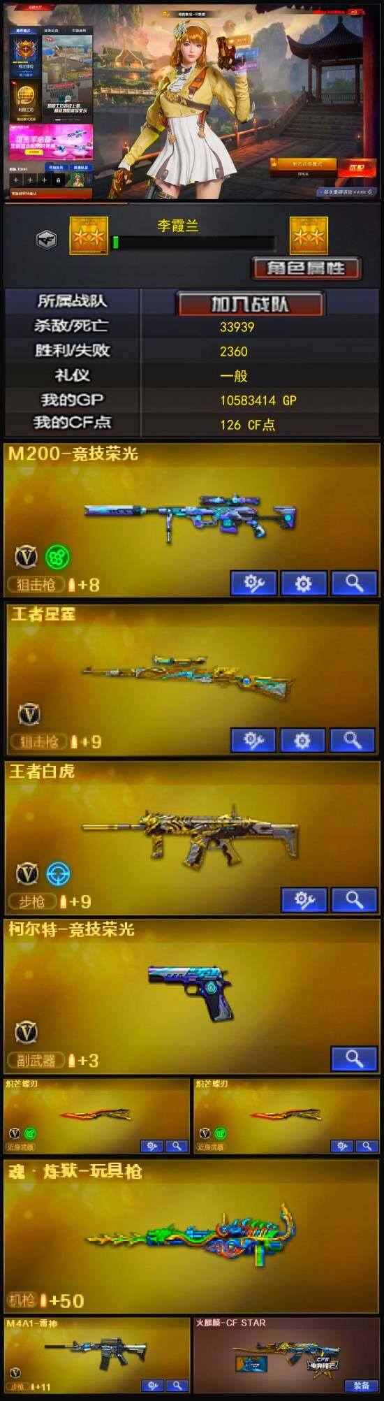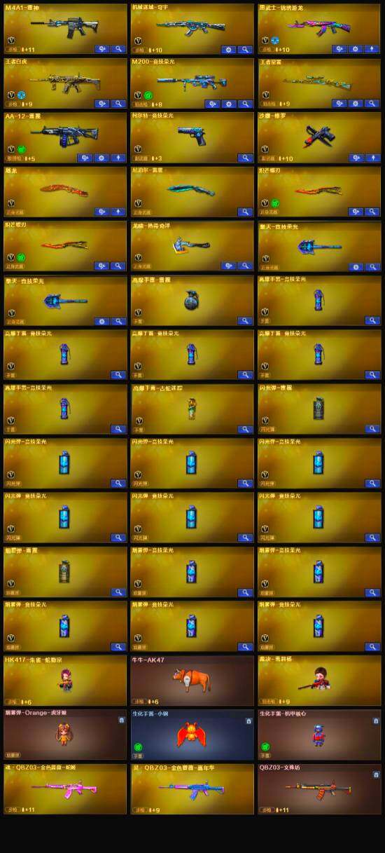 【英雄级武器】:M200-竞技荣光,柯尔特-竞技荣光,擎天-竞技荣光*2,高爆手雷-竞技荣光*5,烟雾弹-竞技荣光*5,闪光弹-竞技荣光*6,M4A1-雷神,AA-12-雷霆,黑武士-锦绣游龙,沙鹰-修罗,炽芒蝶刃*2,屠龙,龙啸-热带奇洋