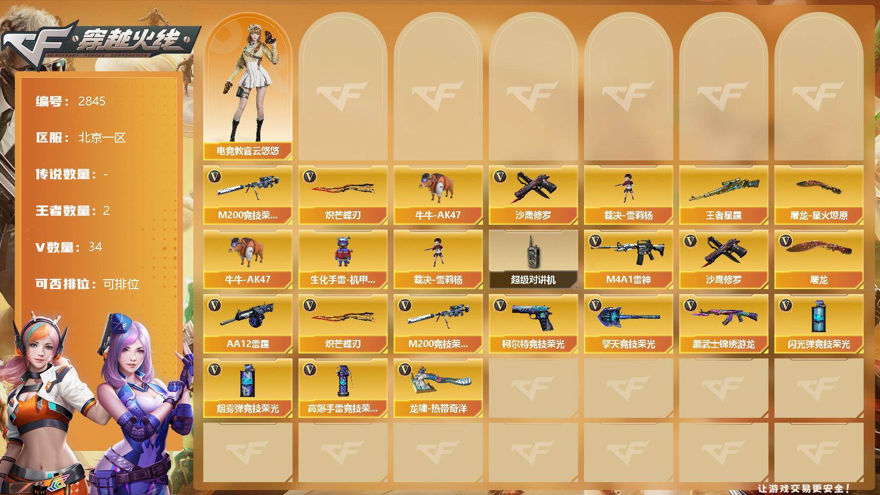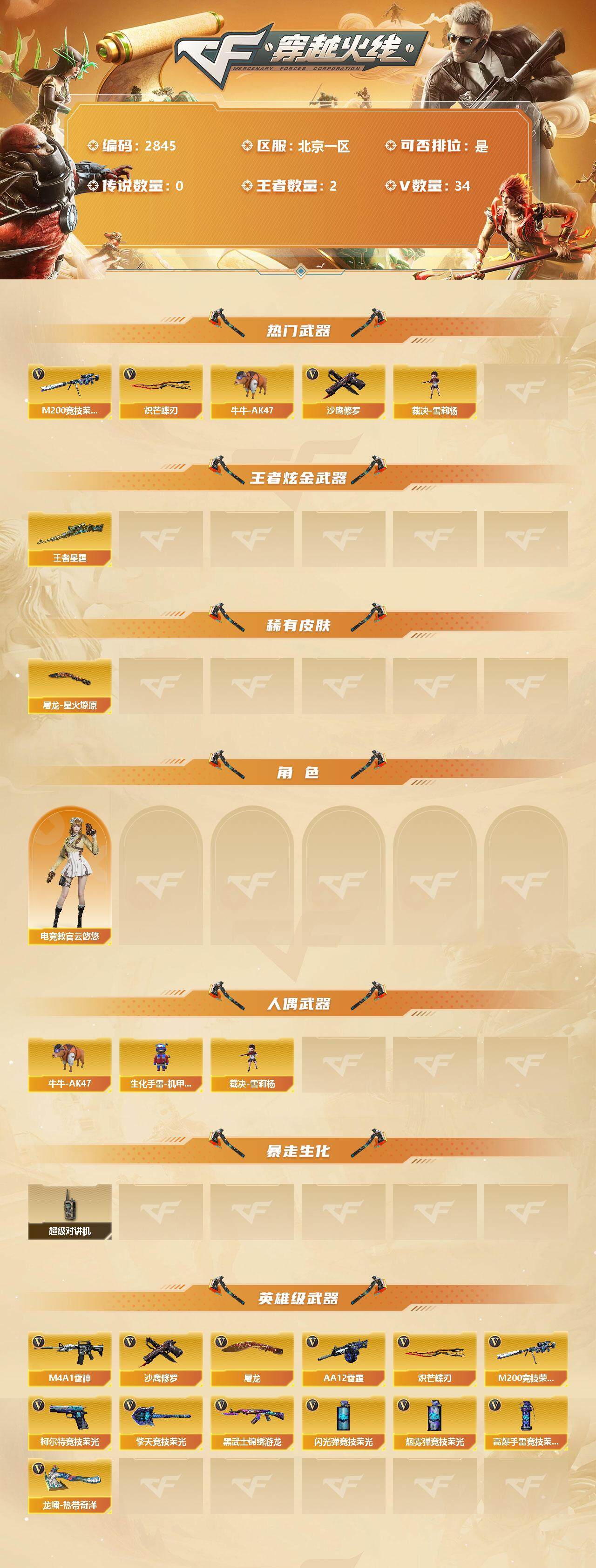 [12959984]北京一区-34V-2王者-0炫金 【热门武器】:M200-竞技荣光,牛牛-AK47,裁决-雪莉杨,沙鹰-修罗,炽芒蝶刃*2 【王者炫金武器】:王者星霆 【稀有皮肤】:屠龙-星火燎原 【角色】:电竞教官-云悠悠 【人偶武器】:裁决-雪莉杨,牛牛-AK47,生化手雷-机甲核心 【暴走生化】:超级对讲机 【英雄级武器】:M200-竞技荣光,柯尔特-竞技荣光,擎天-竞技荣光*2,高爆手雷-竞技荣光*5,烟雾弹-竞技荣光*5,闪光弹-竞技荣光*6,M4A1-雷神,AA-12-雷霆,黑武士-锦绣游龙,沙鹰-修罗,炽芒蝶刃*2,屠龙,龙啸-热带奇洋 【特殊枪械】: