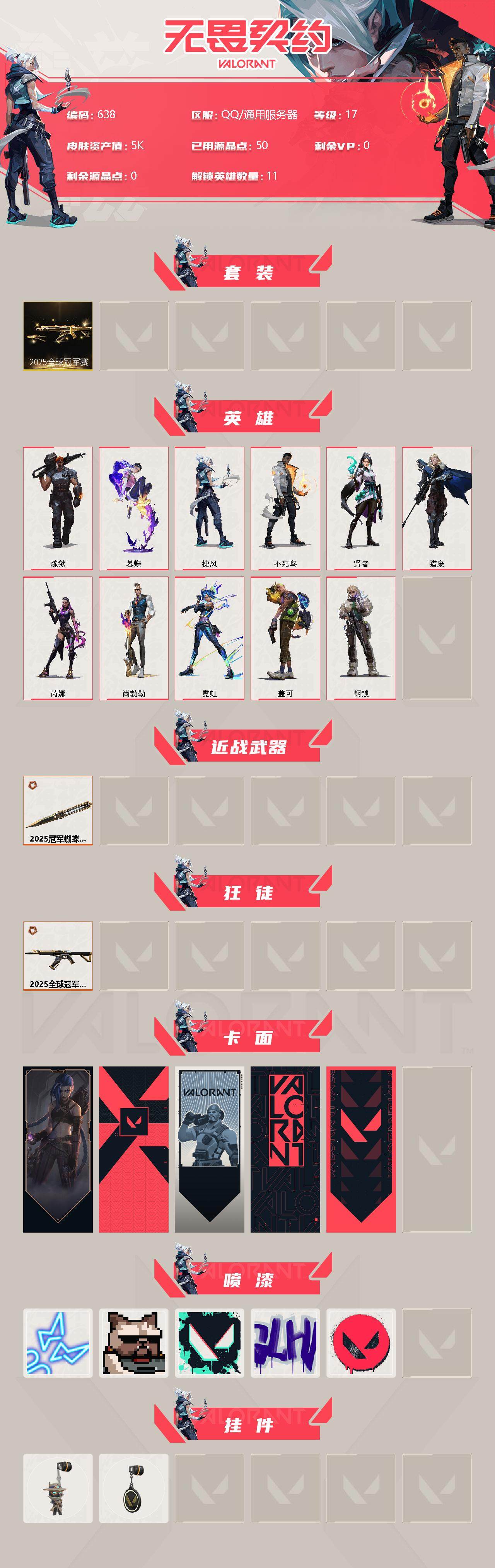 [12959197]【套装】:2025全球冠军赛套装 【英雄】:炼狱,暮蝶,捷风,不死鸟,贤者,猎枭,芮娜,尚勃勒,霓虹,盖可,钢锁 【近战 武器】:近战武器-2025全球冠军赛 蝴蝶刀 【狂徒】:狂徒-2025全球冠军赛 【卡面】:《双城之战》金克丝 卡面,代号红色 卡面,新兵报到 卡面,V契约 卡面,无畏契约 卡面 【喷漆】:霓光四射 喷漆,关门放狗 喷漆,胜利属于无畏契约 喷漆,GLHF 喷漆,无畏契约 喷漆 【挂饰】:无畏契约GO!第一卷 零 挂饰,无畏契约 纪念币 挂饰