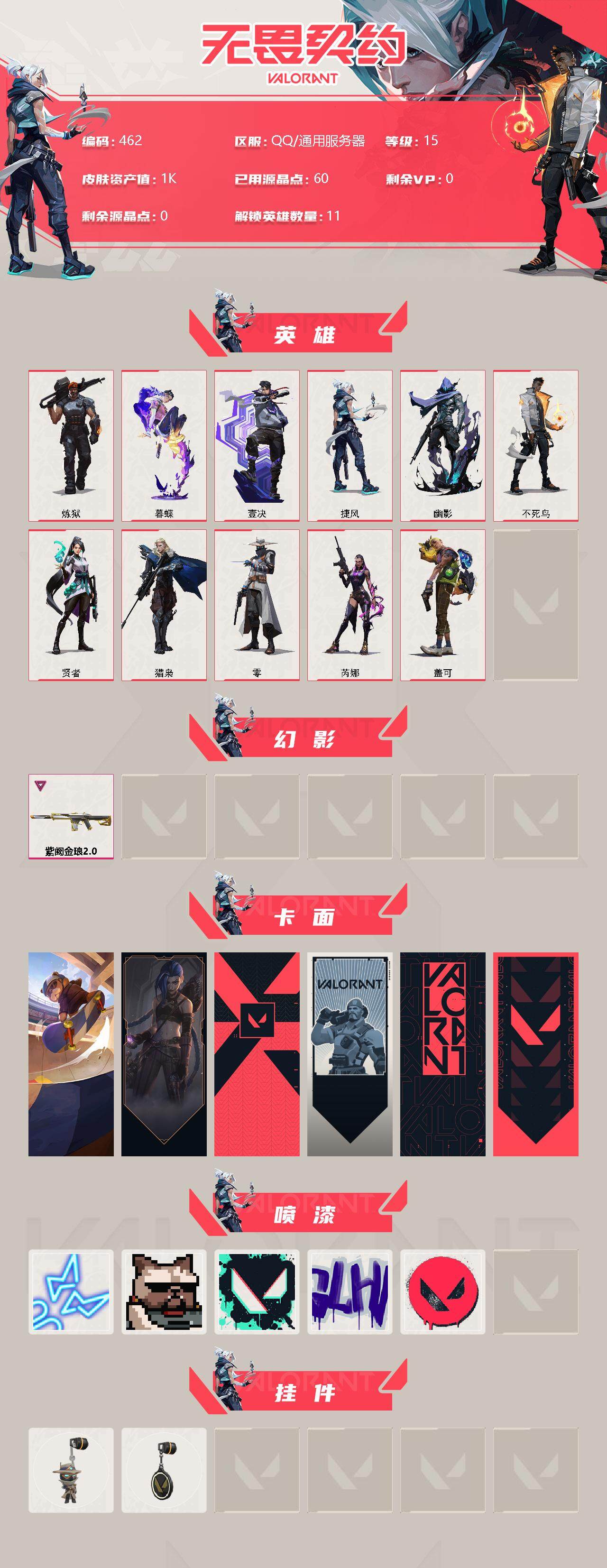 [12958012]【英雄】:炼狱,暮蝶,壹决,捷风,幽影,不死鸟,贤者,猎枭,零,芮娜,盖可 【幻影】:幻影-紫阙金琅//2.0 【卡面】:Clutch 卡面,《双城之战》金克丝 卡面,代号红色 卡面,新兵报到 卡面,V契约 卡面,无畏契约 卡面 【喷漆】:霓光四射 喷漆,关门放狗 喷漆,胜利属于无畏契约 喷漆,GLHF 喷漆,无畏契约 喷漆 【挂饰】:无畏契约GO!第一卷 零 挂饰,无畏契约 纪念币 挂饰