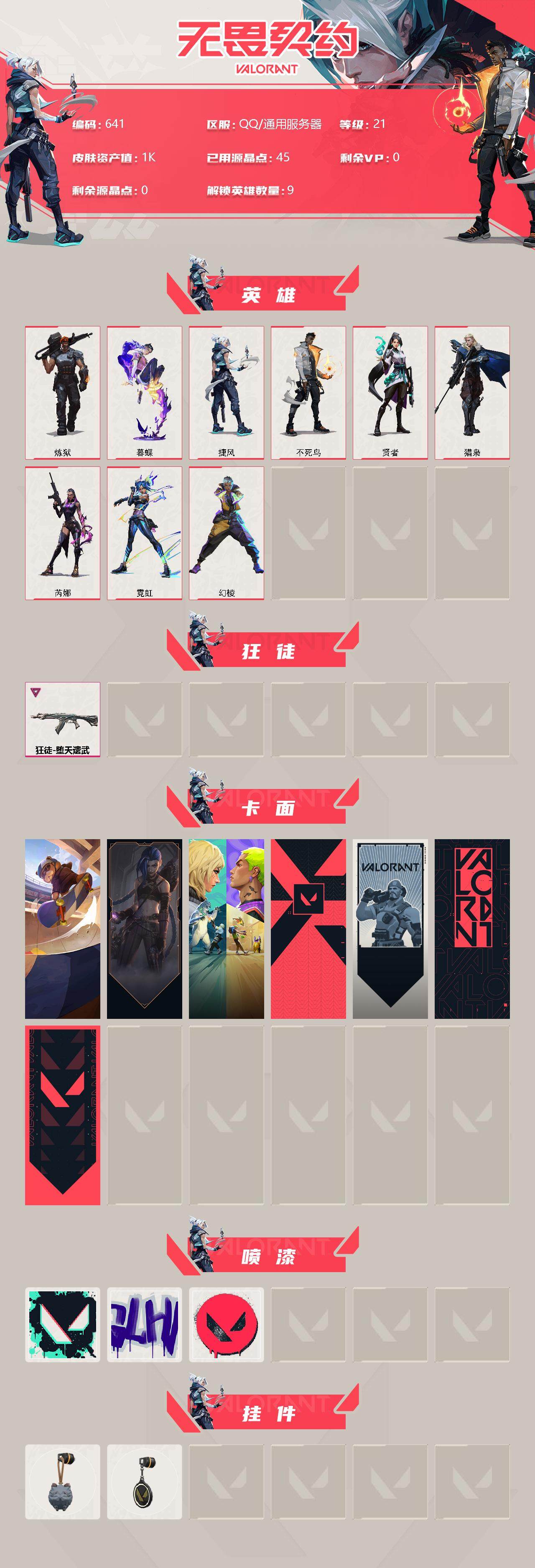 [12959207]【英雄】:幻棱,炼狱,暮蝶,捷风,不死鸟,贤者,猎枭,芮娜,霓虹 【狂徒】:狂徒-堕天遗武 【卡面】:Clutch 卡面,《双城之战》金克丝 卡面,钢锁vs盖可 卡面,代号红色 卡面,新兵报到 卡面,V契约 卡面,无畏契约 卡面 【喷漆】:胜利属于无畏契约 喷漆,GLHF 喷漆,无畏契约 喷漆 【挂饰】:《双城之战》魄罗 挂饰,无畏契约 纪念币 挂饰