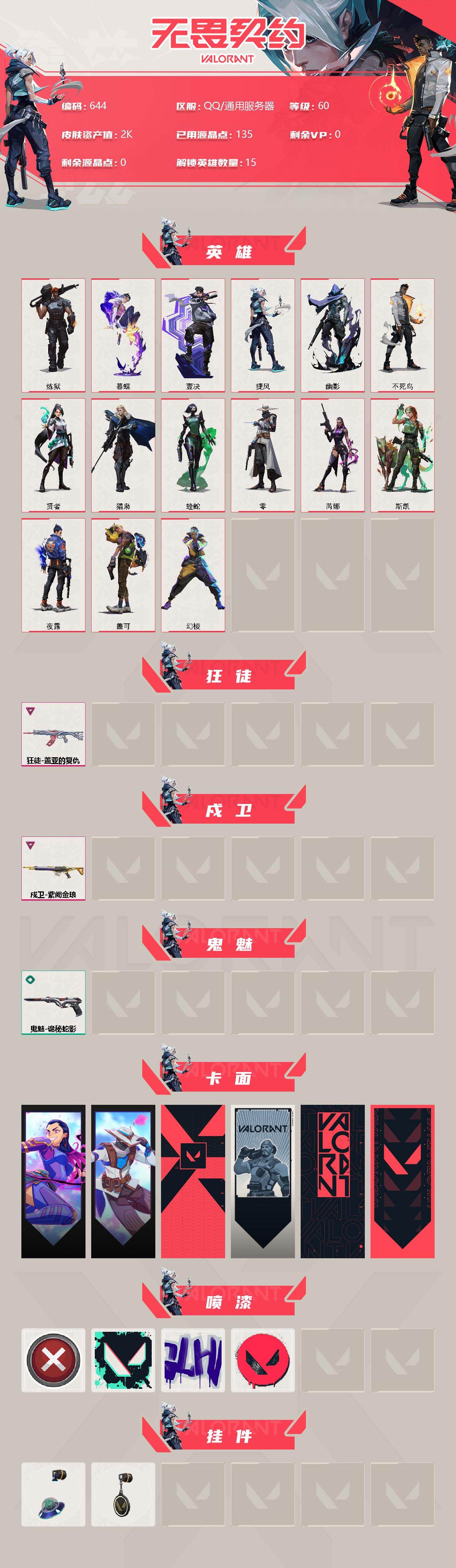 [12959217]【英雄】:幻棱,炼狱,暮蝶,壹决,捷风,幽影,不死鸟,贤者,猎枭,蝰蛇,零,芮娜,斯凯,夜露,盖可 【狂徒】:狂徒-盖亚的复仇 【戍卫】:戍卫-紫阙金琅 【鬼魅】:鬼魅-诡秘蛇影 【卡面】:无畏契约GO!第一卷:芮娜 卡面,无畏契约GO!第一卷:零 卡面,代号红色 卡面,新兵报到 卡面,V契约 卡面,无畏契约 卡面 【喷漆】:买装还是存钱 喷漆,胜利属于无畏契约 喷漆,GLHF 喷漆,无畏契约 喷漆 【挂饰】:天外飞客 挂饰,无畏契约 纪念币 挂饰