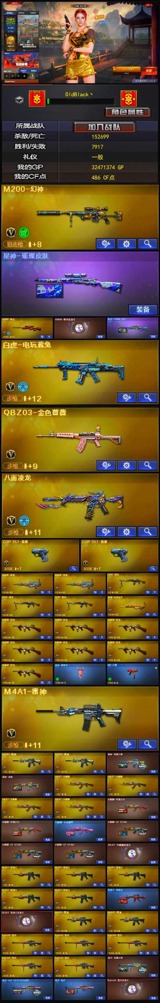 【热门武器】:QBZ03-金色蔷薇,M200-幻神,八面凌龙,死亡之眼,白虎-电玩蓝兔,金色小号,M4A1-黑骑士*5,汤姆逊-烈龙*7,RPK-盘龙*3,加特林-炼狱*2,沙鹰-修罗*5