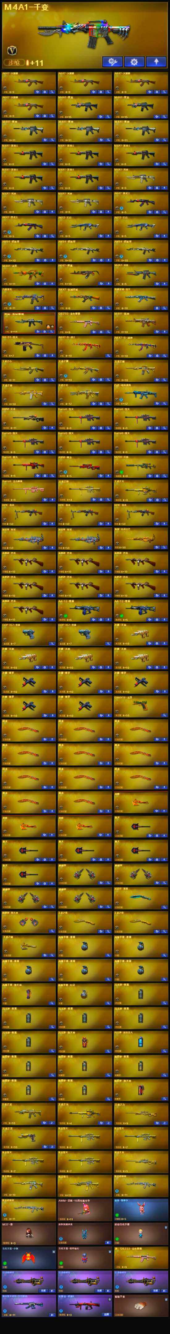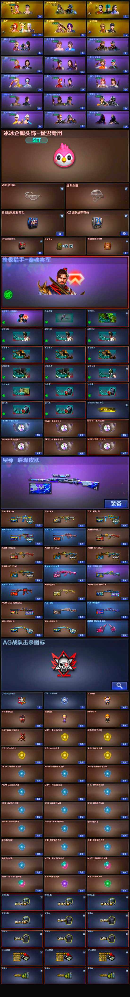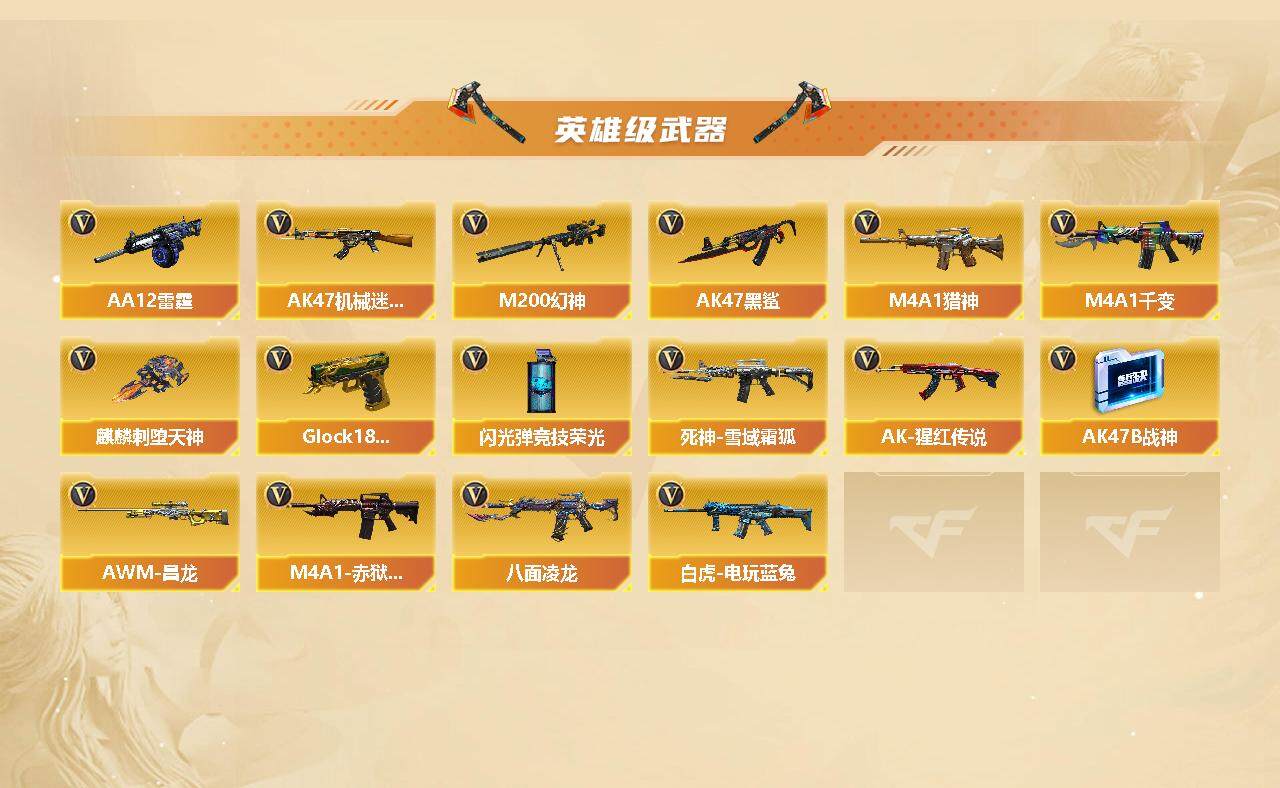 【英雄级武器】:M4A1-千变,AK47-火麒麟*4,M4A1-黑龙*2,M4A1-雷神*3,M4A1-黑骑士*5,M4A1-死神*3,AK47-黑武士*2,AK12-天启*2,AN94-超新星*3,M4A1-武圣,AK47-机械迷城,AK47-黑鲨,M4A1-龙血,死神-雪域霜狐,QBZ03-金色蔷薇,M4A1-猎神,AK-47-猩红传说*5,AK47-B-战神,白虎-电玩蓝兔,八面凌龙,AWM-天龙,Barrett-毁灭*5,Barrett-极光,AWM-裁决,M200-幻神,RPK-盘龙*3,加特林-炼狱*2,汤姆逊-烈龙*7,AA-12-雷霆*2,沙鹰-修罗*5,沙鹰-天神*4,Glock18-武圣,屠龙*11,龙啸*3,麒麟刺-堕天神,擎天*5,麒麟刺*4,闪光弹-竞技荣光,M4A1-赤狱骑士,AWM-昌龙