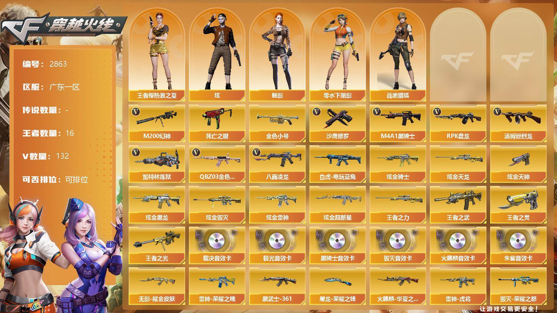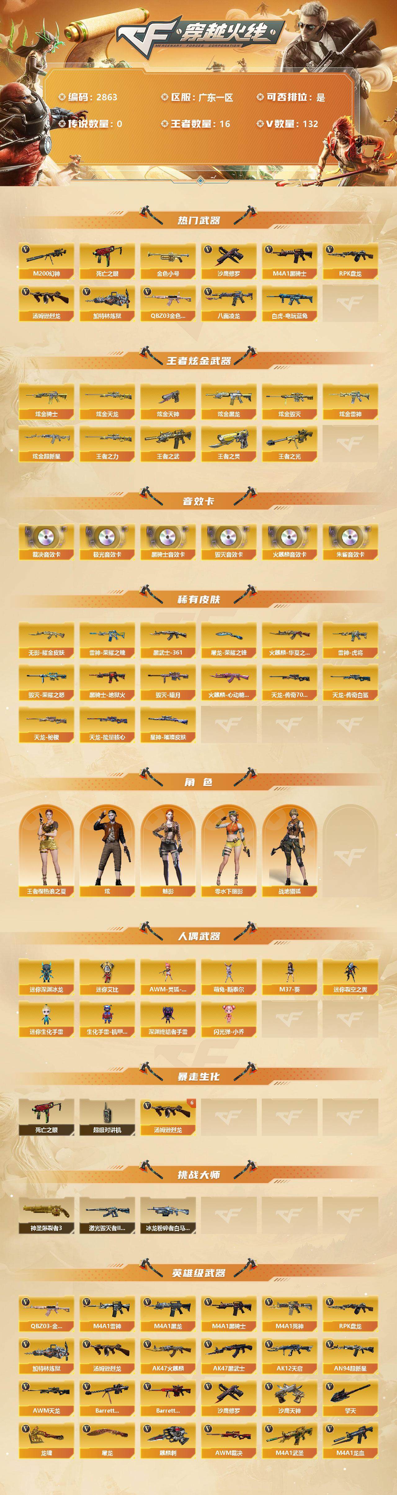 [12960103]广东一区-132V-16王者-13炫金 【热门武器】:QBZ03-金色蔷薇,M200-幻神,八面凌龙,死亡之眼,白虎-电玩蓝兔,金色小号,M4A1-黑骑士*5,汤姆逊-烈龙*7,RPK-盘龙*3,加特林-炼狱*2,沙鹰-修罗*5 【王者炫金武器】:王者之武,王者之光,王者之力,王者之灵,炫金骑士,炫金天龙,炫金天神*2,炫金黑龙*2,炫金毁灭*4,炫金雷神,炫金超新星*2 【音效卡】:AK47-火麒麟音效卡,M4A1-黑骑士音效卡,Barrett-毁灭音效卡,Barrett-极光音效卡,AWM-裁决音效卡,HK417-朱雀音效卡 【稀有皮肤】:星神-璀璨皮肤,雷神-荣耀之魄,雷神-虎将,火麒麟-华夏之心*2,火麒麟-心动糖果,黑骑士-地狱火,毁灭-暗月,毁灭-荣耀之怒,天龙-秘银,天龙-能量核心,AWM-天龙-传奇70KG,AWM-天龙-传奇白鲨,无影耀金皮肤,AK47-黑武士-361,屠龙-荣耀之锋*2 【角色】:魅影,炫,战地猎狐,王者樱-热浪之夏,零-水下丽影 【人偶武器】:AWM-灵狐-15周年嘉年华,萌兔-斯泰尔,M37-葵,迷你深渊冰龙,迷你艾比,迷你裂空之翼,迷你生化手雷,生化手雷-机甲核心,深渊终结者手雷,闪光弹-小乔 【暴走生化】:死亡之眼,超级对讲机 【挑战大师】:神圣爆裂者III,激光毁灭者III-白马银枪,冰龙粉碎者-白马银枪 【英雄级武器】:M4A1-千变,AK47-火麒麟*4,M4A1-黑龙*2,M4A1-雷神*3,M4A1-黑骑士*5,M4A1-死神*3,AK47-黑武士*2,AK12-天启*2,AN94-超新星*3,M4A1-武圣,AK47-机械迷城,AK47-黑鲨,M4A1-龙血,死神-雪域霜狐,QBZ03-金色蔷薇,M4A1-猎神,AK-47-猩红传说*5,AK47-B-战神,白虎-电玩蓝兔,八面凌龙,AWM-天龙,Barrett-毁灭*5,Barrett-极光,AWM-裁决,M200-幻神,RPK-盘龙*3,加特林-炼狱*2,汤姆逊-烈龙*7,AA-12-雷霆*2,沙鹰-修罗*5,沙鹰-天神*4,Glock18-武圣,屠龙*11,龙啸*3,麒麟刺-堕天神,擎天*5,麒麟刺*4,闪光弹-竞技荣光,M4A1-赤狱骑士,AWM-昌龙 【特殊枪械】:5黑骑士,6烈龙,3盘龙,2炼狱