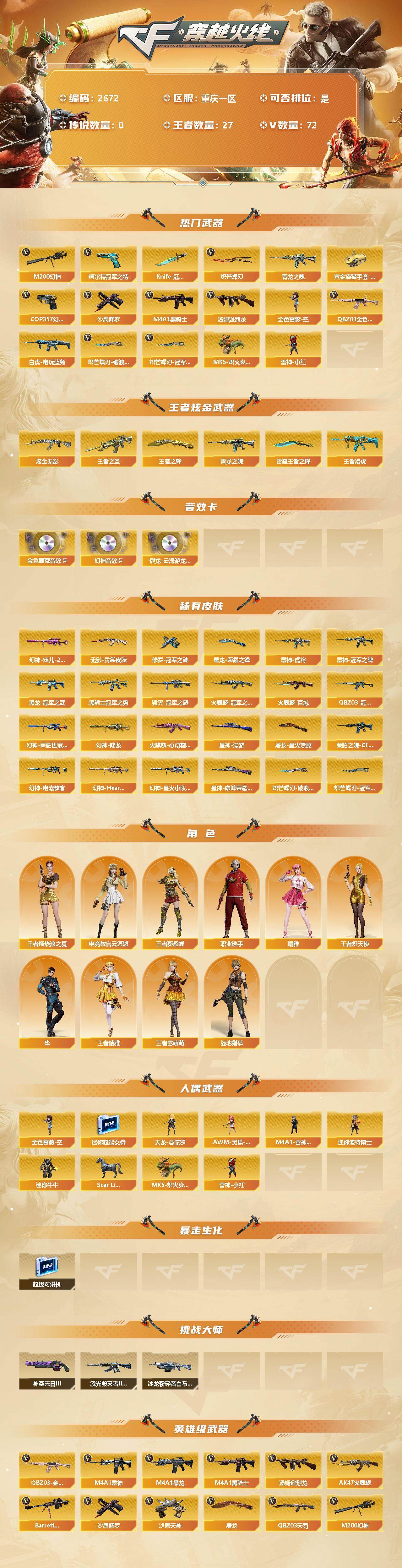 [12958342]重庆一区-72V-27王者-1炫金 【热门武器】:QBZ03-金色蔷薇,M200-幻神,青龙之魄,白虎-电玩蓝兔,柯尔特-冠军之特,M4A1-黑骑士,汤姆逊-烈龙,金色蔷薇-空,MK5-炽火炎龙,雷神-小红,COP 357-幻灵,沙鹰-修罗,Knife-冠军之刃,炽芒蝶刃,炽芒蝶刃-破浪逐光 皮肤,炽芒蝶刃-冠军炽芒皮肤,黄金猫猫手套-白鲨 【王者炫金武器】:炫金无影,王者之圣,青龙之魄,王者凌虎,王者之锋,雷霆王者之锋 【音效卡】:烈龙-云海游龙音效卡,M200-幻神音效卡,QBZ03-金色蔷薇音效卡 【稀有皮肤】:幻神-宠儿-2021MVP,幻神-降龙,M200-幻神-荣耀世冠白鲨,幻神-电流骇客 皮肤,幻神-Heartshot 皮肤,幻神-星火小队签名臻藏版 皮肤,星神-漫游,星神-巅峰荣耀 皮肤,QBZ03-冠军之薇,雷神-虎将,雷神-冠军之魄,火麒麟-冠军之心,火麒麟-百城,火麒麟-心动糖果,黑骑士-冠军之势,黑龙-冠军之武,毁灭-冠军之怒,荣耀之魄-CFPL十周年臻藏版,无影-霓裳皮肤,修罗-冠军之魂,炽芒蝶刃-破浪逐光 皮肤,炽芒蝶刃-冠军炽芒皮肤,屠龙-荣耀之锋,屠龙-星火燎原 【角色】:王者樱-热浪之夏,王者-葵-貂蝉,王者炽天使,王者晴雅,王者雾萌萌,电竞教官-云悠悠,晴雅,华,战地猎狐,职业选手 【人偶武器】:MK5-炽火炎龙,雷神-小红,金色蔷薇-空,天龙-曼陀罗*2,AWM-灵狐-15周年嘉年华,M4A1-雷神-精英刀锋,Scar Light-马枪,迷你超能女侍,迷你波特博士,迷你牛牛 【暴走生化】:超级对讲机 【挑战大师】:神圣爆裂者-末日III,激光毁灭者III-白马银枪,冰龙粉碎者-白马银枪 【英雄级武器】:QBZ03-云龙,COP 357-云龙*2,高爆手雷-竞技荣光,烟雾弹-竞技荣光,闪光弹-竞技荣光,COP 357-幻灵,幻灵之锋,烈火-动感闪耀,天神-动感闪耀,屠龙-动感闪耀,手雷-动感闪耀,FAMAS G2-天戎,QBZ03-金色蔷薇,白虎-电玩蓝兔,无影-神兵利器,M4A1-雷神*3,M4A1-黑龙,M4A1-黑骑士,汤姆逊-烈龙,AK47-火麒麟,Barrett-毁灭,QBZ03-天罚,M200-幻神,黑武士-锦绣游龙,超新星-热带奇洋,死神-雪域霜狐,AK-47-猩红传说*2,M4A1-赤狱骑士,柯尔特-冠军之特,沙