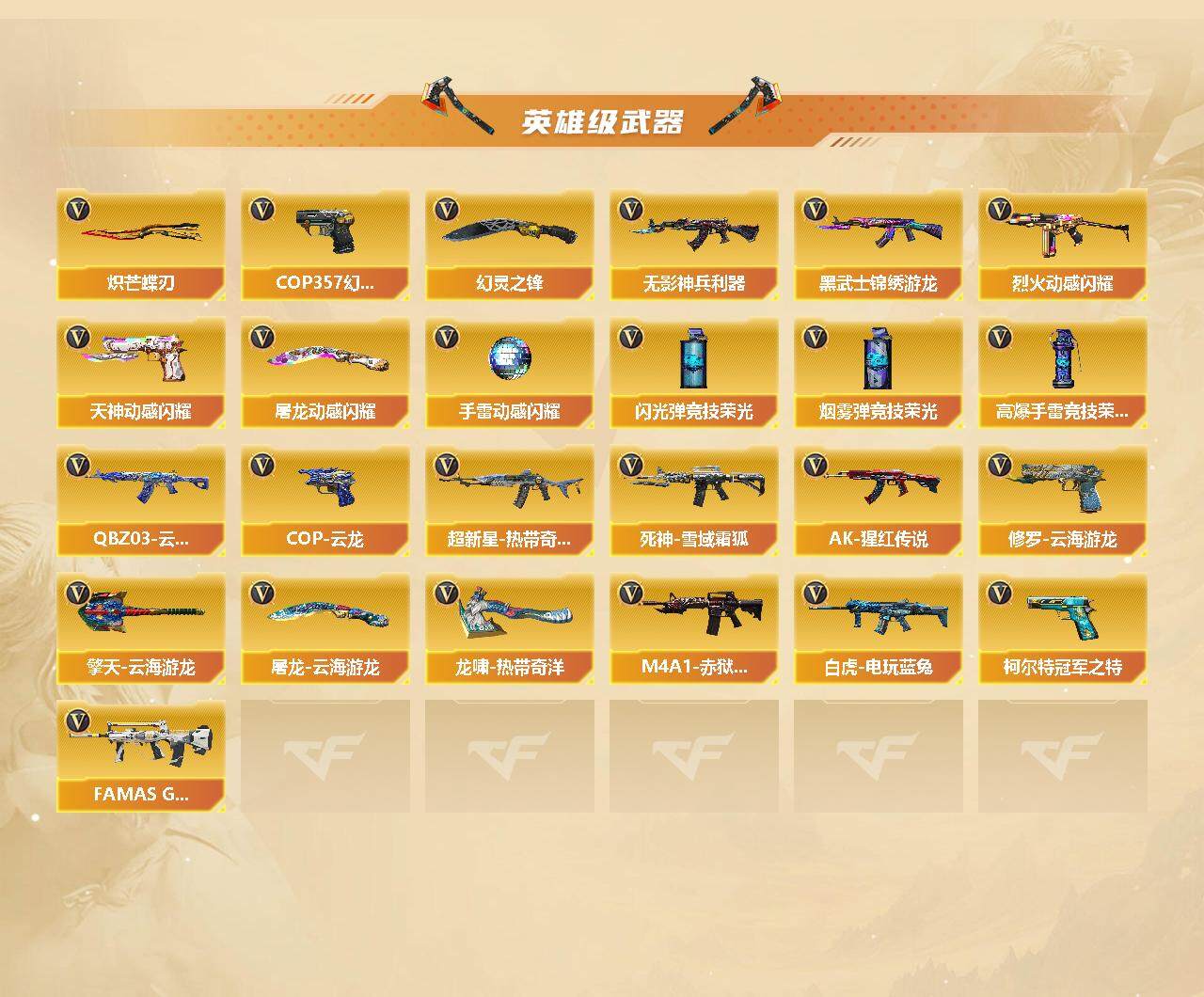 【英雄级武器】:QBZ03-云龙,COP 357-云龙*2,高爆手雷-竞技荣光,烟雾弹-竞技荣光,闪光弹-竞技荣光,COP 357-幻灵,幻灵之锋,烈火-动感闪耀,天神-动感闪耀,屠龙-动感闪耀,手雷-动感闪耀,FAMAS G2-天戎,QBZ03-金色蔷薇,白虎-电玩蓝兔,无影-神兵利器,M4A1-雷神*3,M4A1-黑龙,M4A1-黑骑士,汤姆逊-烈龙,AK47-火麒麟,Barrett-毁灭,QBZ03-天罚,M200-幻神,黑武士-锦绣游龙,超新星-热带奇洋,死神-雪域霜狐,AK-47-猩红传说*2,M4A1-赤狱骑士,柯尔特-冠军之特,沙