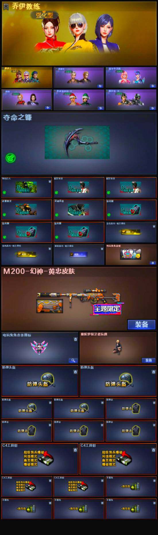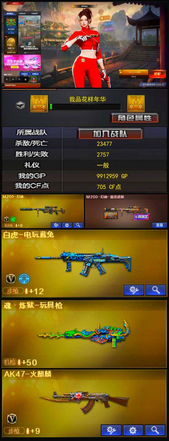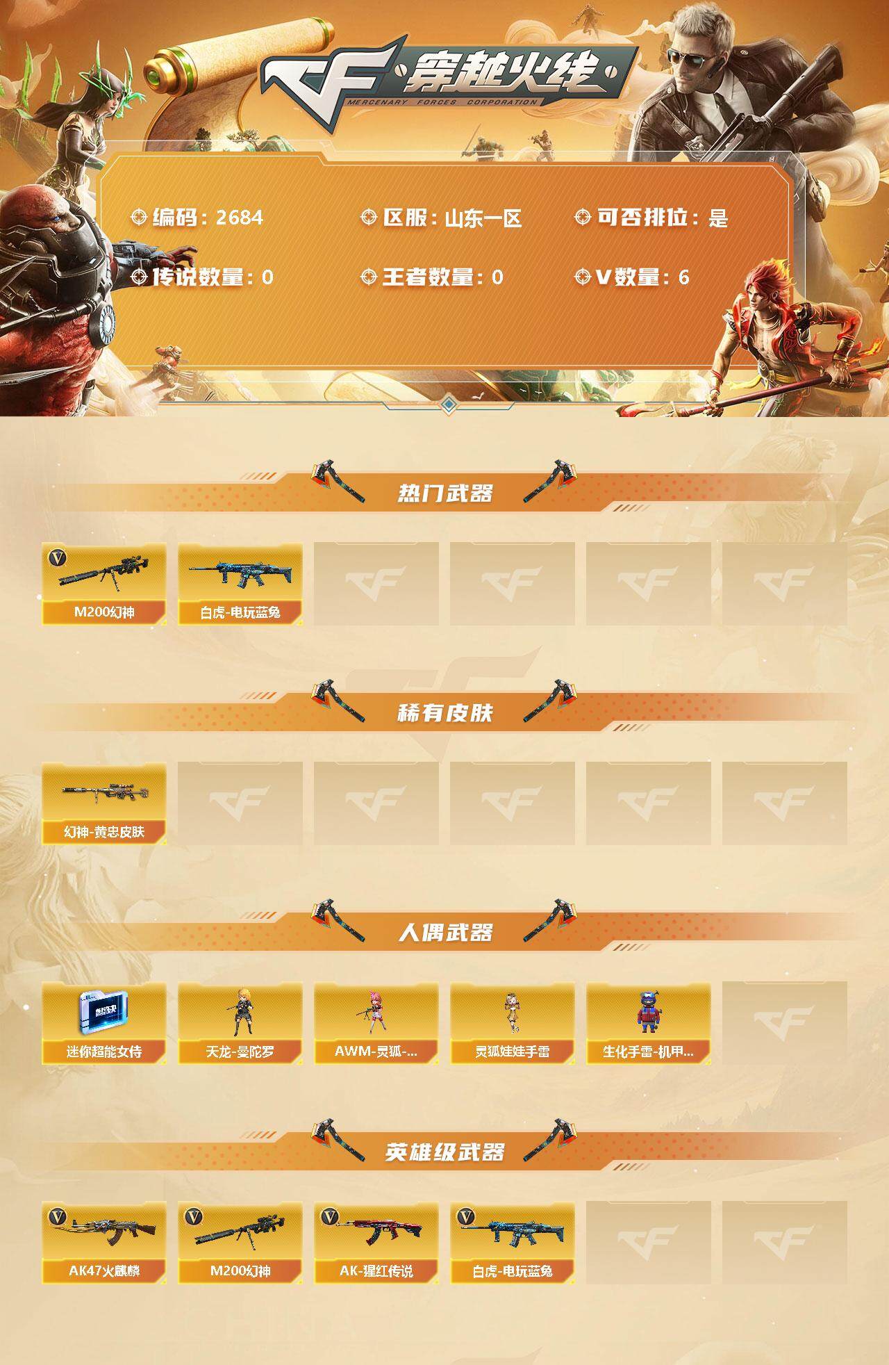 [12958392]山东一区-6V-0王者-0炫金 【热门武器】:M200-幻神,白虎-电玩蓝兔 【稀有皮肤】:M200-幻神-黄忠皮肤 【人偶武器】:天龙-曼陀罗,AWM-灵狐-15周年嘉年华,迷你超能女侍,灵狐娃娃手雷,生化手雷-机甲核心 【英雄级武器】:白虎-电玩蓝兔,AK47-火麒麟,M200-幻神,AK-47-猩红传说 【特殊枪械】:
