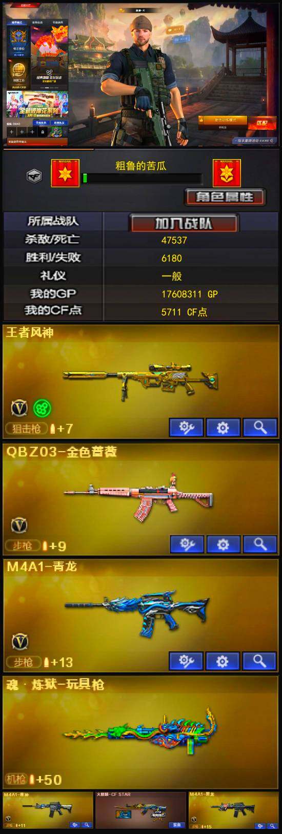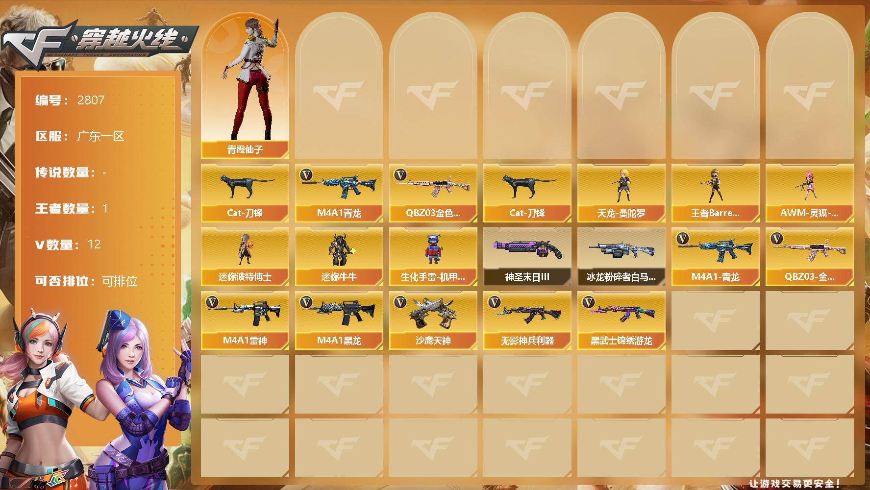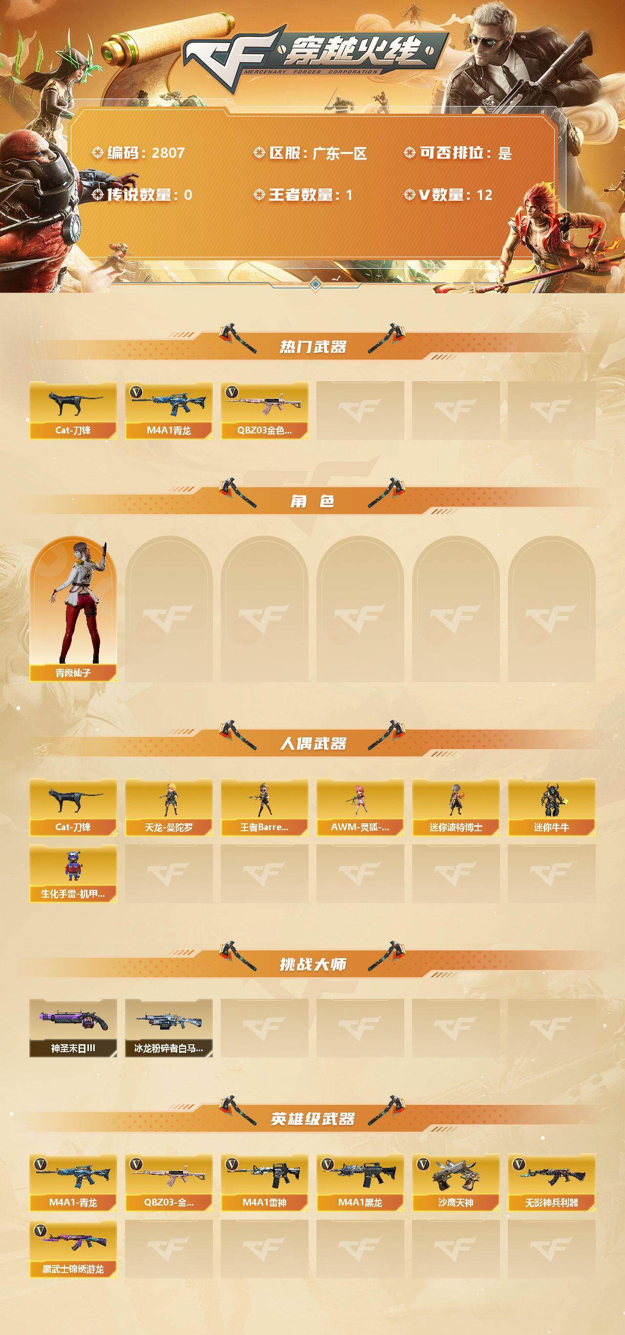 [12959707]广东一区-12V-1王者-0炫金 【热门武器】:QBZ03-金色蔷薇,M4A1-青龙,Cat-刀锋 【角色】:青霞仙子 【人偶武器】:天龙-曼陀罗,王者Barrett-英勇金戈,AWM-灵狐-15周年嘉年华,Cat-刀锋,迷你波特博士,迷你牛牛,生化手雷-机甲核心 【挑战大师】:神圣爆裂者-末日III,冰龙粉碎者-白马银枪 【英雄级武器】:QBZ03-金色蔷薇,M4A1-青龙,无影-神兵利器,M4A1-雷神,M4A1-黑龙,黑武士-锦绣游龙,沙鹰-天神 【特殊枪械】: