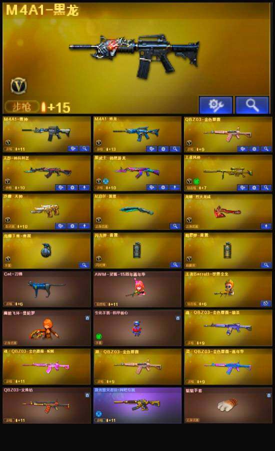 【英雄级武器】:QBZ03-金色蔷薇,M4A1-青龙,无影-神兵利器,M4A1-雷神,M4A1-黑龙,黑武士-锦绣游龙,沙鹰-天神