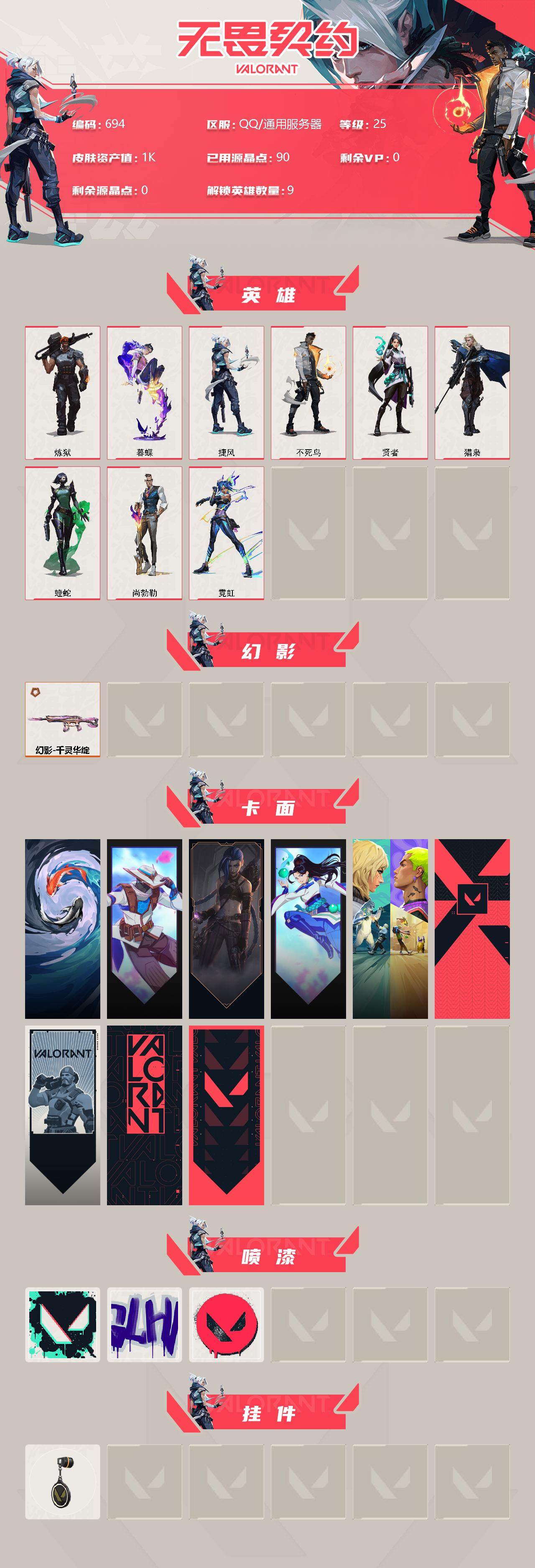 [12959797]【英雄】:炼狱,暮蝶,捷风,不死鸟,贤者,猎枭,蝰蛇,尚勃勒,霓虹 【幻影】:幻影-千灵华绽 【卡面】:红鳞松叶 卡面,无畏契约GO!第一卷:零 卡面,《双城之战》金克丝 卡面,无畏契约GO!第一卷:贤者 卡面,钢锁vs盖可 卡面,代号红色 卡面,新兵报到 卡面,V契约 卡面,无畏契约 卡面 【喷漆】:胜利属于无畏契约 喷漆,GLHF 喷漆,无畏契约 喷漆 【挂饰】:无畏契约 纪念币 挂饰