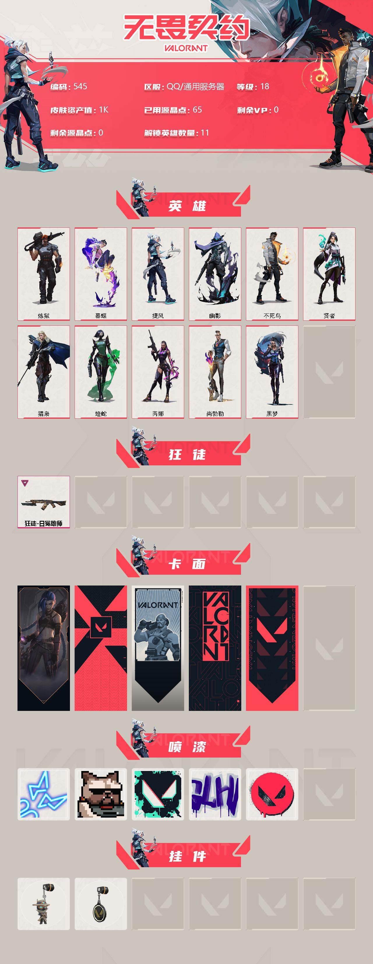 [12958622]【英雄】:炼狱,暮蝶,捷风,幽影,不死鸟,贤者,猎枭,蝰蛇,芮娜,尚勃勒,黑梦 【狂徒】:狂徒-日冕雄师 【卡面】:《双城之战》金克丝 卡面,代号红色 卡面,新兵报到 卡面,V契约 卡面,无畏契约 卡面 【喷漆】:霓光四射 喷漆,关门放狗 喷漆,胜利属于无畏契约 喷漆,GLHF 喷漆,无畏契约 喷漆 【挂饰】:无畏契约GO!第一卷 零 挂饰,无畏契约 纪念币 挂饰