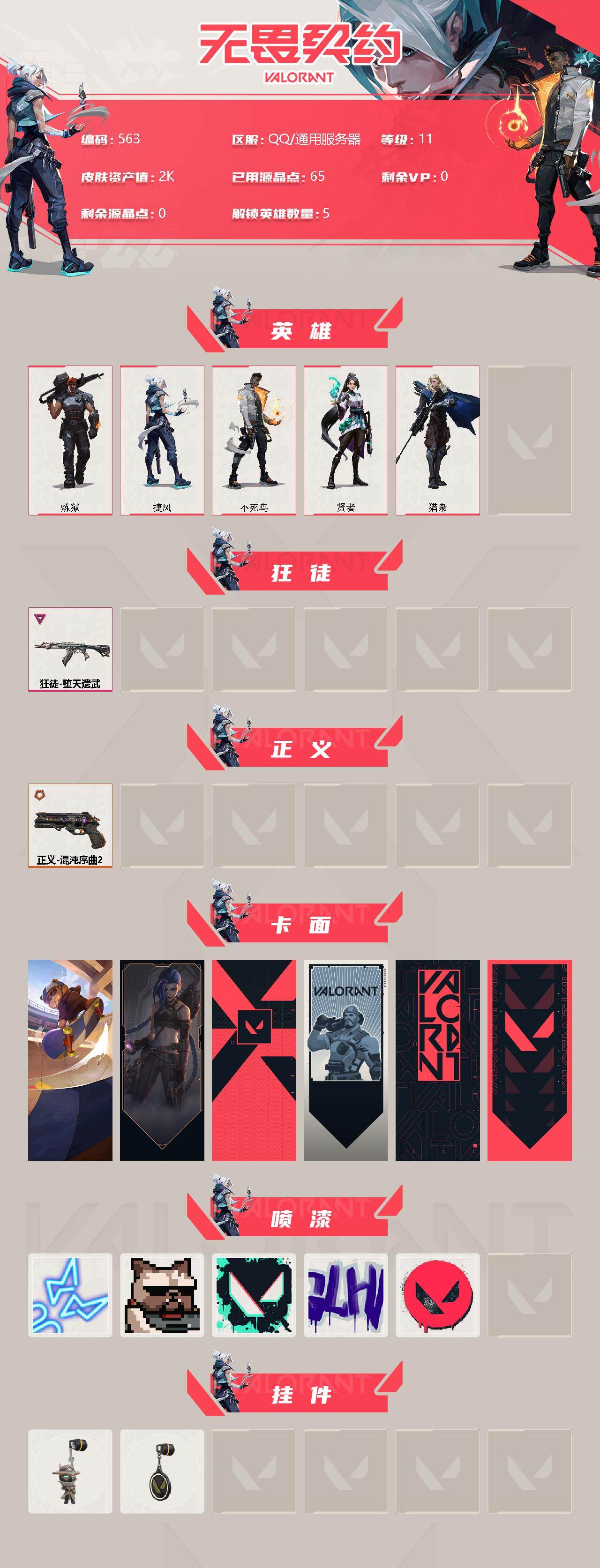 [12958752]【英雄】:炼狱,捷风,不死鸟,贤者,猎枭 【狂徒】:狂徒-堕天遗武 【正义】:正义-混沌序曲//2.0 【卡面】:Clutch 卡面,《双城之战》金克丝 卡面,代号红色 卡面,新兵报到 卡面,V契约 卡面,无畏契约 卡面 【喷漆】:霓光四射 喷漆,关门放狗 喷漆,胜利属于无畏契约 喷漆,GLHF 喷漆,无畏契约 喷漆 【挂饰】:无畏契约GO!第一卷 零 挂饰,无畏契约 纪念币 挂饰
