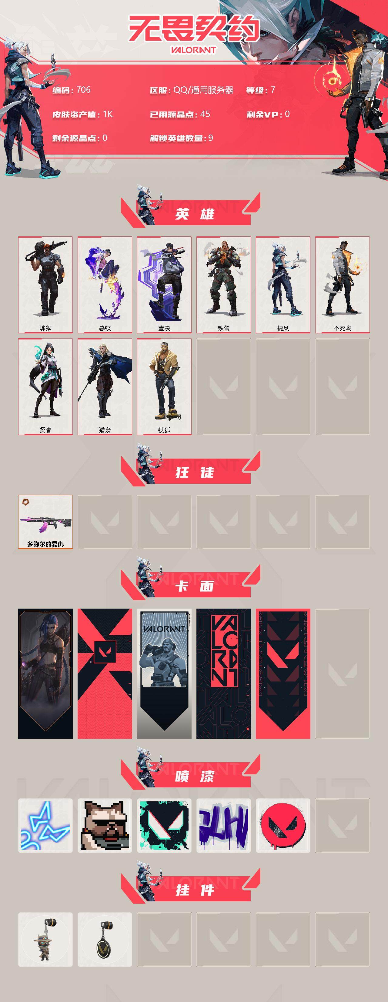 [12960077]【英雄】:炼狱,暮蝶,钛狐,壹决,铁臂,捷风,不死鸟,贤者,猎枭 【狂徒】:狂徒-多弥尔的复仇 【卡面】:《双城之战》金克丝 卡面,代号红色 卡面,新兵报到 卡面,V契约 卡面,无畏契约 卡面 【喷漆】:霓光四射 喷漆,关门放狗 喷漆,胜利属于无畏契约 喷漆,GLHF 喷漆,无畏契约 喷漆 【挂饰】:无畏契约GO!第一卷 零 挂饰,无畏契约 纪念币 挂饰