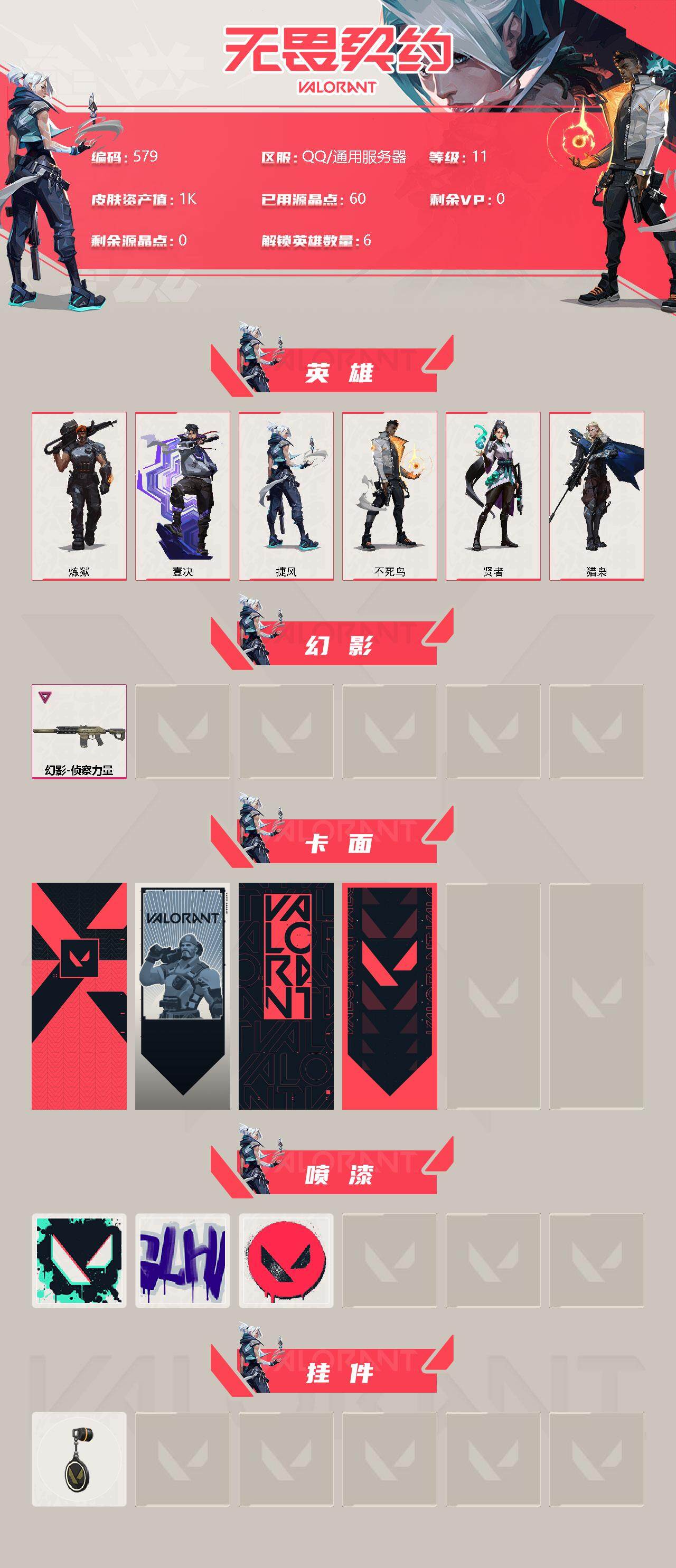 [12958812]【英雄】:炼狱,壹决,捷风,不死鸟,贤者,猎枭 【幻影】:幻影-侦察力量 【卡面】:代号红色 卡面,新兵报到 卡面,V契约 卡面,无畏契约 卡面 【喷漆】:胜利属于无畏契约 喷漆,GLHF 喷漆,无畏契约 喷漆 【挂饰】:无畏契约 纪念币 挂饰