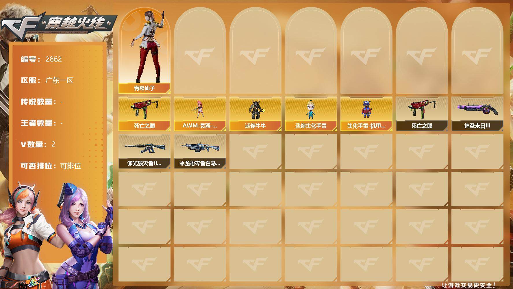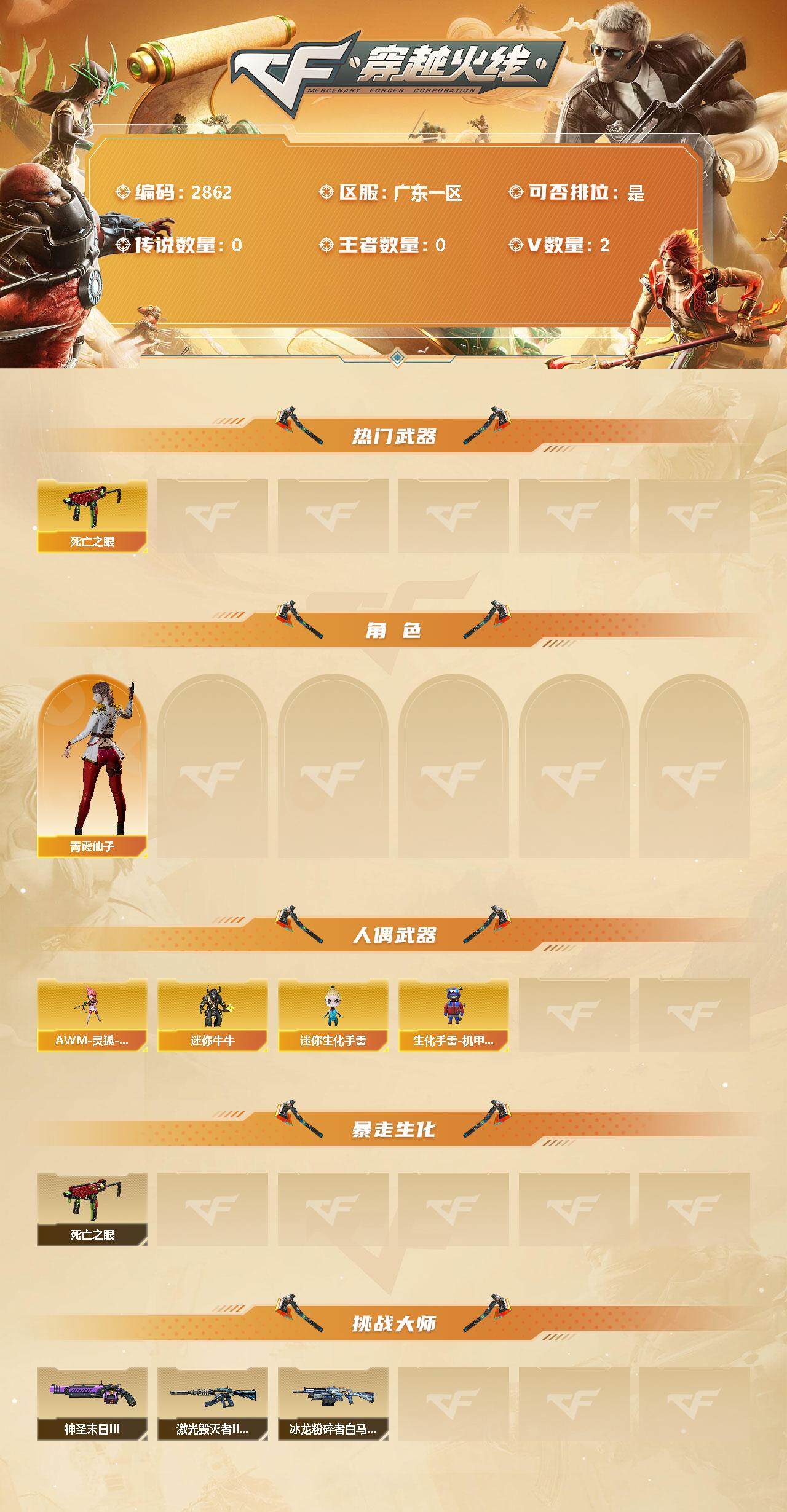 [12960097]广东一区-2V-0王者-0炫金 【热门武器】:死亡之眼 【角色】:青霞仙子 【人偶武器】:AWM-灵狐-15周年嘉年华,迷你牛牛,迷你生化手雷,生化手雷-机甲核心*3 【暴走生化】:死亡之眼 【挑战大师】:神圣爆裂者-末日III,激光毁灭者III-白马银枪,冰龙粉碎者-白马银枪 【特殊枪械】: