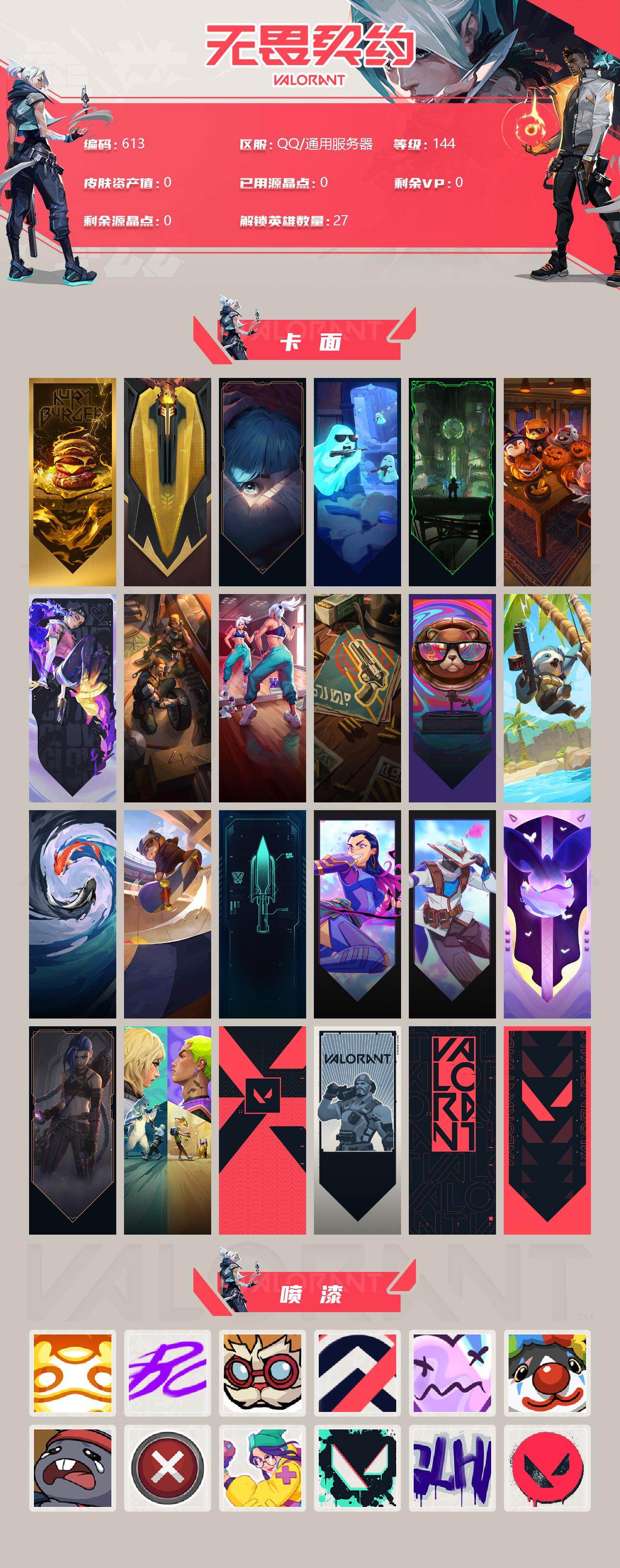 【喷漆】:嗨宝南瓜灯 喷漆,嘭! 喷漆,都算到了 喷漆,控场勿近 喷漆,伤心心 喷漆,小丑猫 喷漆,熊抱 喷漆,买装还是存钱 喷漆,无畏契约GO!第一卷:奇乐 喷漆,胜利属于无畏契约 喷漆,GLHF 喷漆,无畏契约 喷漆