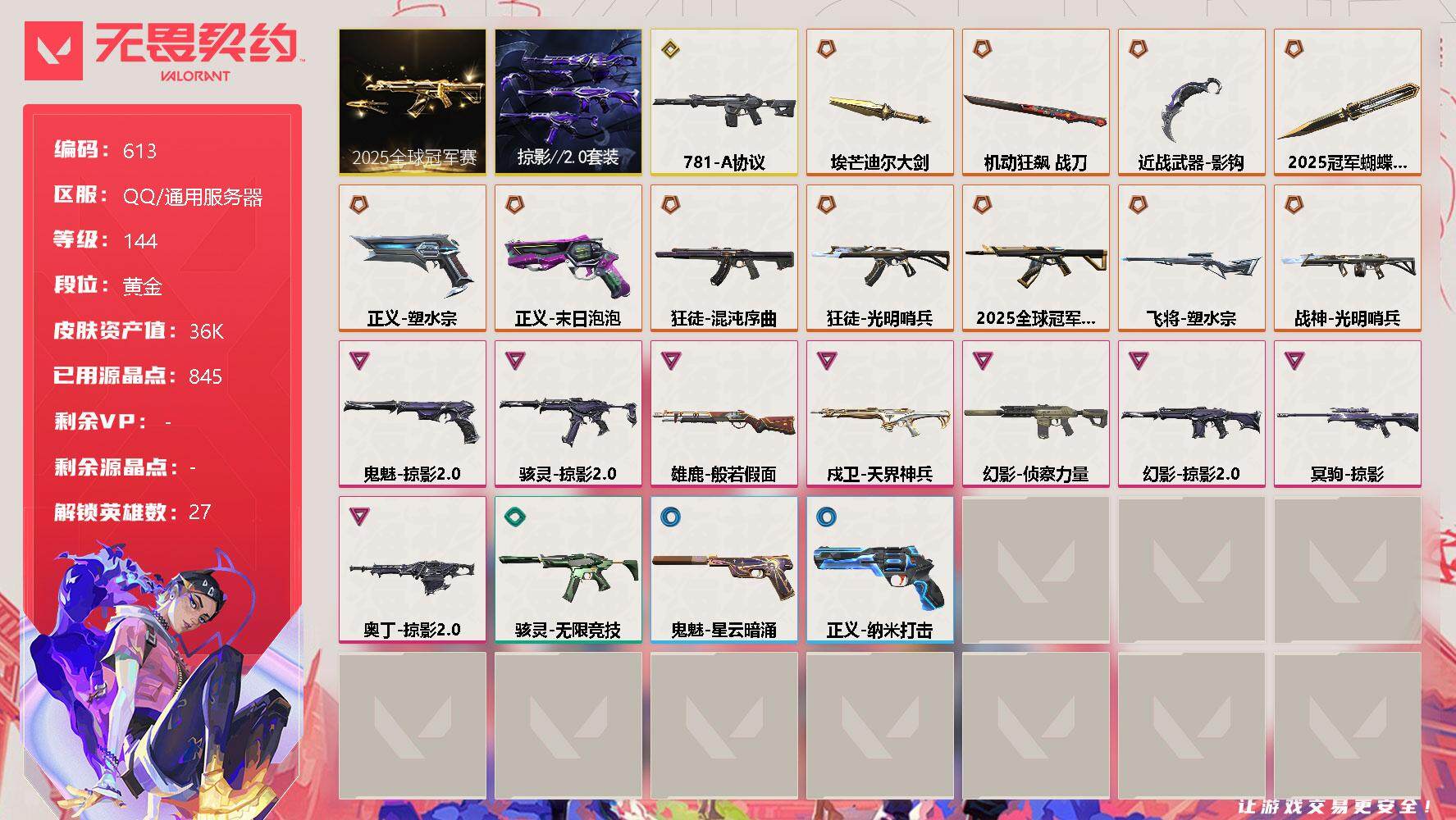 [12959002]【套装】:2025全球冠军赛套装,掠影//2.0套装 【英雄】:幻棱,炼狱,维斯,暮蝶,钛狐,壹决,铁臂,捷风,雷兹,幽影,不死鸟,贤者,猎枭,蝰蛇,零,芮娜,奇乐,尚勃勒,霓虹,斯凯,夜露,星礈,K/O,海神,盖可,黑梦,钢锁 【近战 武器】:近战武器-2025全球冠军赛 蝴蝶刀,近战武器-影钩,近战武器-埃芒迪尔大剑,近战武器-机动狂飙 战刀 【狂徒】:狂徒-2025全球冠军赛,狂徒-光明哨兵,狂徒-混沌序曲 【幻影】:幻影-781-A协议,幻影-侦察力量,幻影-掠影//2.0 【戍卫】:戍卫-天界神兵 【冥驹】:冥驹-掠影 【飞将】:飞将-塑水宗 【战神】:战神-光明哨兵 【奥丁】:奥丁-掠影//2.0 【雄鹿】:雄鹿-般若假面 【骇灵】:骇灵-掠影//2.0,骇灵-无限竞技 【正义】:正义-塑水宗,正义-末日泡泡,正义-纳米打击 【鬼魅】:鬼魅-掠影//2.0,鬼魅-星云暗涌 【卡面】:终章:激斗汉堡 卡面,进入射程 卡面,《双城之战》拥抱 卡面,精灵大战 卡面,欢迎来到底城 卡面,南瓜盛典 卡面,无畏契约:暮蝶 卡面,修车达人 卡面,热舞环节 卡面,正义的化身 卡面,音熊登场 卡面,树懒大作战 卡面,红鳞松叶 卡面,Clutch 卡面,零点嗅探设计图 卡面,无畏契约GO!第一卷:芮娜 卡面,无畏契约GO!第一卷:零 卡面,化茧成蝶 卡面,《双城之战》金克丝 卡面,钢锁vs盖可 卡面,代号红色 卡面,新兵报到 卡面,V契约 卡面,无畏契约 卡面 【喷漆】:嗨宝南瓜灯 喷漆,嘭! 喷漆,都算到了 喷漆,控场勿近 喷漆,伤心心 喷漆,小丑猫 喷漆,熊抱 喷漆,买装还是存钱 喷漆,无畏契约GO!第一卷:奇乐 喷漆,胜利属于无畏契约 喷漆,GLHF 喷漆,无畏契约 喷漆 【挂饰】:终章:猫猫木乃伊 挂饰,悠闲鸡块 挂饰,伞绳 挂饰,《双城之战》小蛋糕 挂饰,第九季//第三幕 纪念币 挂饰,工具腰带 挂饰,无畏契约GO!第一卷 零 挂饰,熔岩灯 挂饰,第九季//第二幕 纪念币 挂饰,第八季//第三幕 纪念币 挂饰,天外飞客 挂饰,无畏契约 纪念币 挂饰